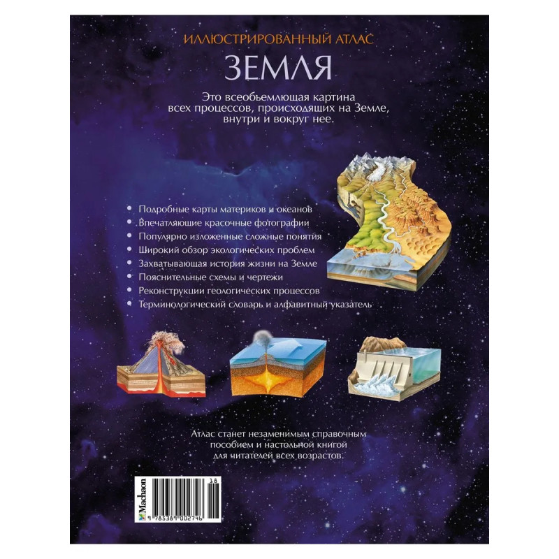 В иллюстрированном атласе "Земля" представлен широкий научный взгляд на нашу планету. В атласе представлены подробные карты материков и океанов. А терминологический словарь и алфавитный указатель станут замечательным подспорьем для любознательных читателей всех возрастов.