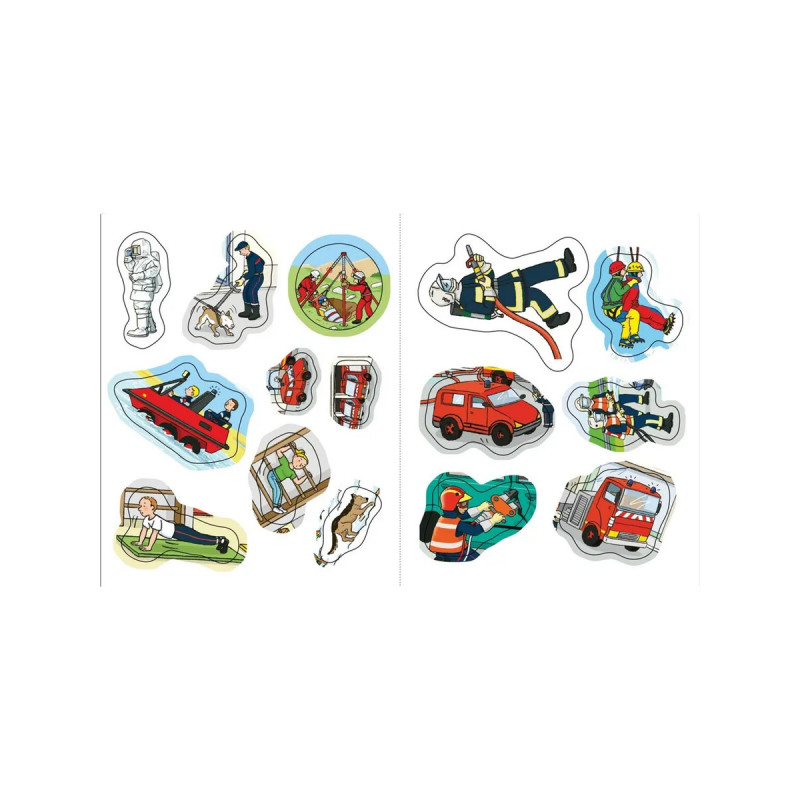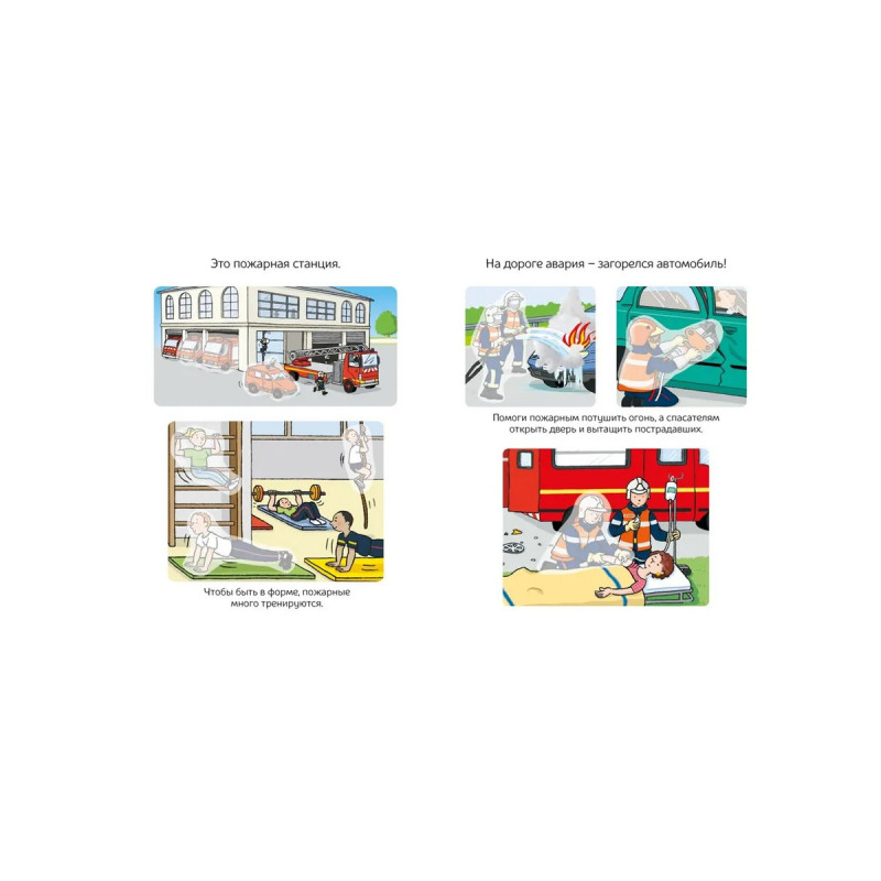 При пожарах, авариях и других несчастных случаях на помощь людям приходят пожарные и спасатели. Посмотри, как они действуют в экстренных ситуациях и какие средства и оборудование применяют в своей работе. Подбери для каждого случая нужные наклейки.