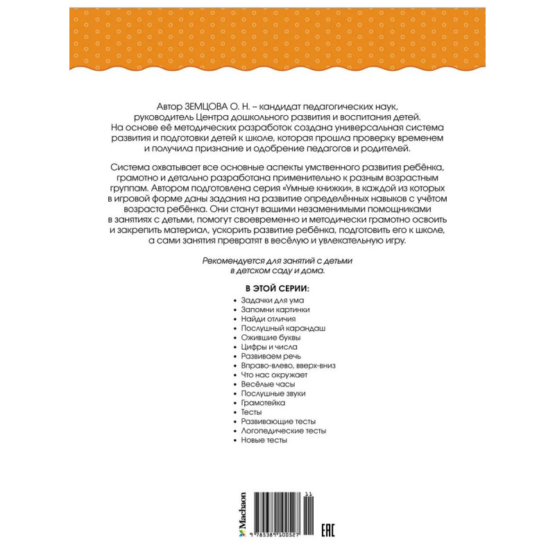 Система охватывает все основные аспекты умственного развития ребёнка, грамотно и детально разработана применительно к разным возрастным группам. Автором подготовлена серия «Умные книжки», в каждой из которых в игровой форме даны задания на развитие определённых навыков с учётом возраста ребёнка. Они станут вашими незаменимыми помощниками в занятиях с детьми, помогут своевременно и методически грамотно освоить и закрепить материал, ускорить развитие ребёнка, подготовить его к школе, а сами занятия превратят в весёлую и увлекательную игру.