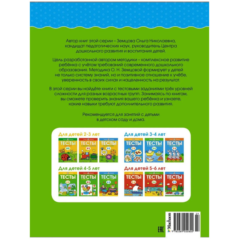 Автор книг этой серии - Земцова Ольга Николаевна, кандидат педагогических наук, руководитель Центра дошкольного развития и воспитания детей. .Цель разработанной автором методики - комплексное развитие ребёнка с учётом требований современного дошкольного образования. Методика О. Н. Земцовой формирует у детей не только систему знаний, но и позитивное отношение к учёбе, уверенность в своих силах и нацеленность на результат. .В этой серии вы найдёте книги с тестовыми заданиями трёх уровней сложности для разных возрастных групп. Занимаясь по книгам, вы сможете проверить знания вашего ребёнка и узнаете, какие навыки требуют дополнительного развития. .Рекомендуется для занятий с детьми в детском саду и дома.