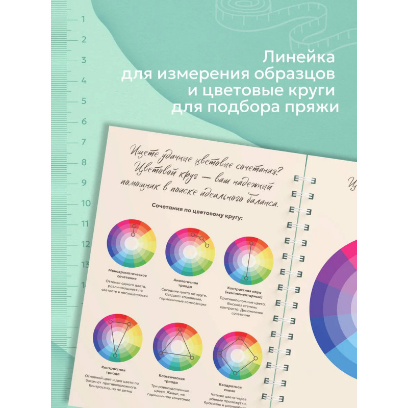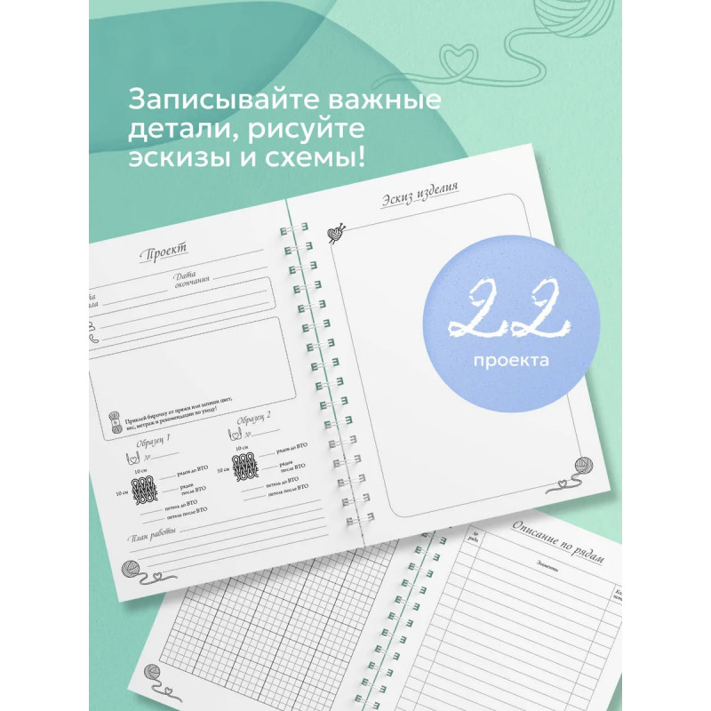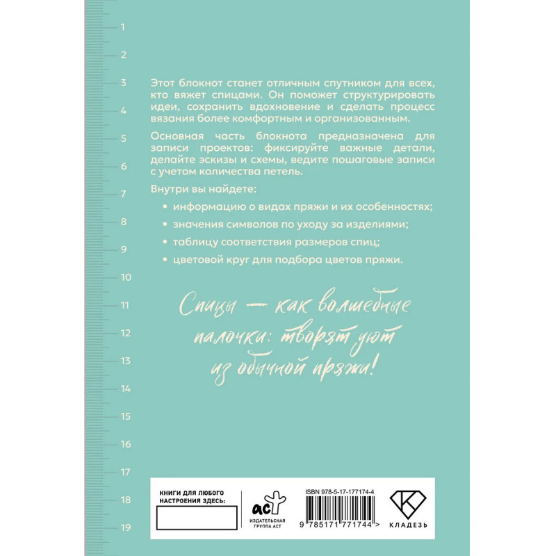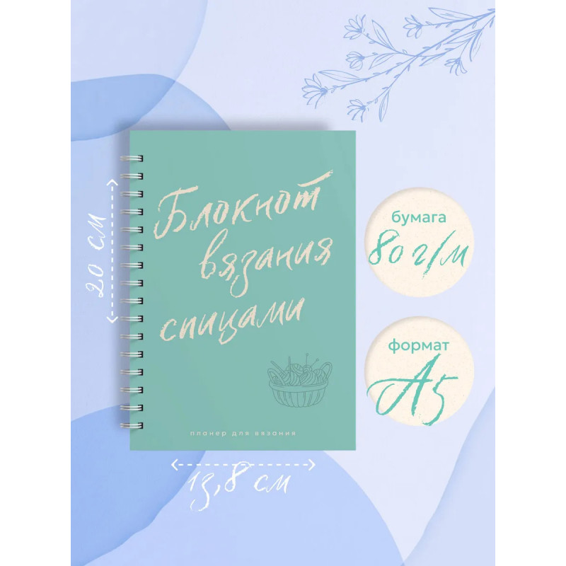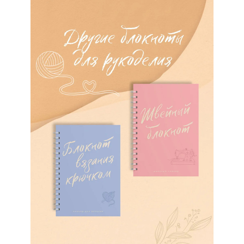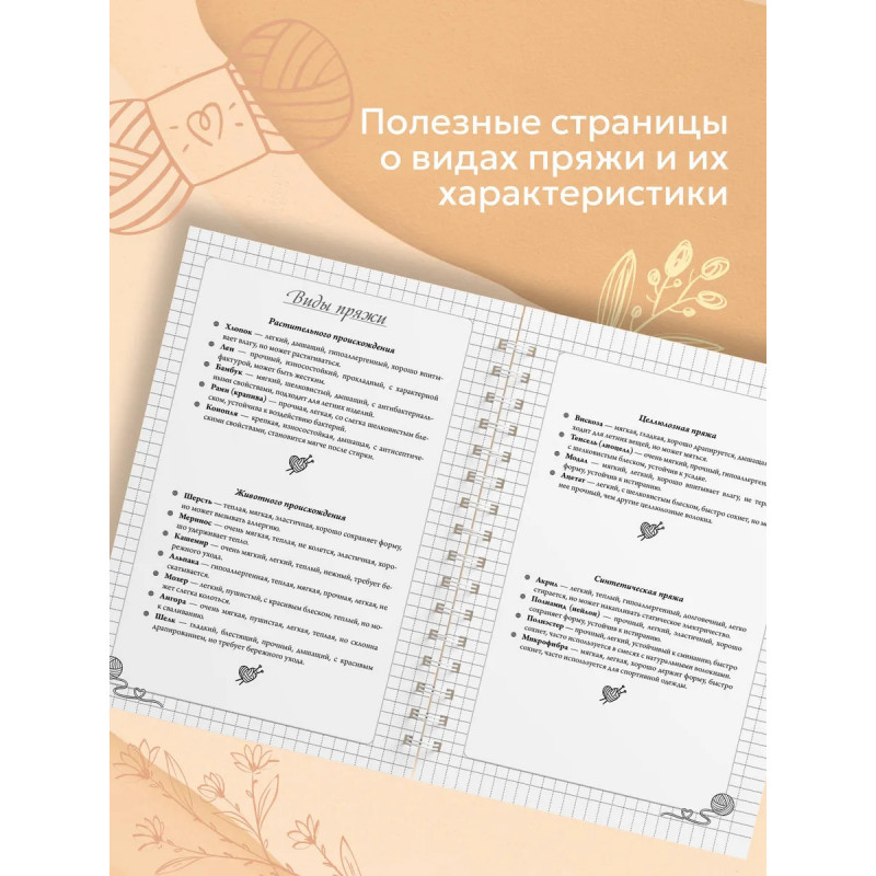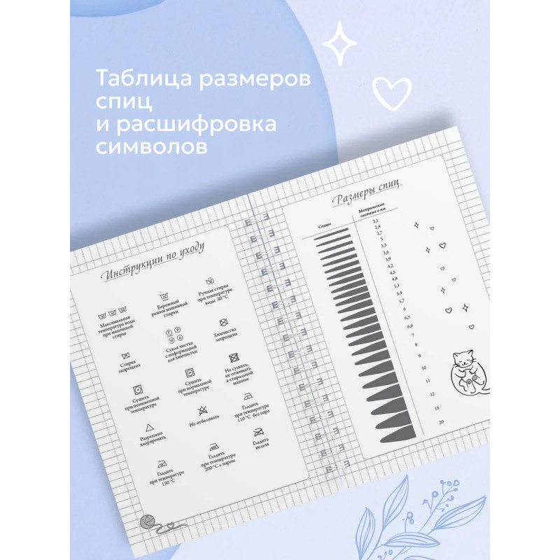 Этот блокнот станет отличным спутником для всех, кто вяжет спицами. Он содержит полезные сведения: информацию о видах пряжи, значения символов по уходу за изделиями, таблицу размеров спиц — все это будет у вас под рукой в любой момент. Большая часть блокнота отведена под проекты: здесь удобно записывать важные детали, делать эскизы и схемы, а также вести пошаговые заметки с точным учетом количества петель. С его помощью вы сможете структурировать свои идеи, сохранить вдохновение и сделать процесс вязания более комфортным и организованным.