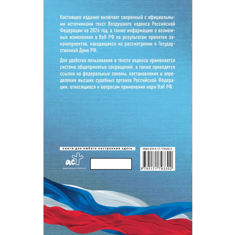 Данное издание Воздушного кодекса РФ сверено с официальным источником и приводится по состоянию на 2026 год. Кодекс учитывает все изменения, опубликованные в официальных источниках на момент подписания издания в печать. В издании представлена информация о возможных изменениях в ВзК РФ по результатам принятия законопроектов, находящихся на рассмотрении в Государственной Думе РФ. Для удобства пользования в тексте кодекса применяется система общепринятых сокращений, а также приводятся ссылки на федеральные законы, относящиеся к вопросам применения норм ВзК РФ.
