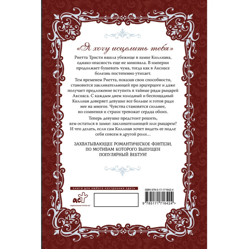 Риетта Тристи нашла убежище в замке Киллиана, однако опасность еще не миновала. В империи продолжает бушевать чума, тогда как в Аксиасе болезнь постепенно утихает. Тем временем Риетта, показав свои способности, становится заклинательницей при эрцгерцоге и даже получает предложение вступить в тайные ряды рыцарей Аксиаса. С каждым днем холодный и беспощадный Киллиан доверяет девушке все больше и готов ради нее на многое. Чувства становятся сильнее, но сомнения и страхи тревожат сердца обоих. Теперь девушке предстоит решить, кем остаться в замке: заклинательницей или рыцарем? И что делать, если сам Киллиан хочет видеть ее подле себя совсем в другой роли…