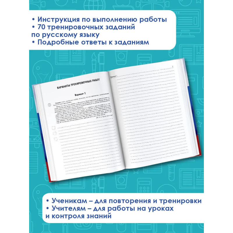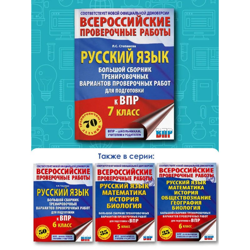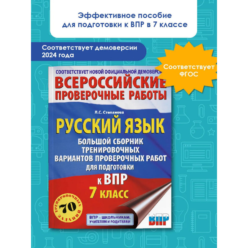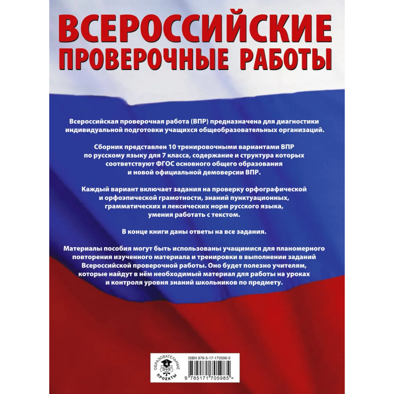 Пособие предназначено для подготовки учащихся 7 классов общеобразовательных организаций к Всероссийской проверочной работе. Сборник включает 10 тренировочных вариантов работ, которые по своему содержанию соответствуют Федеральному государственному образовательному стандарту основного общего образования. Каждый вариант содержит задания на проверку орфографической, орфоэпической, пунктуационной и языковой грамотности, умения работать с текстом. В конце книги даны ответы на все задания. Пособие может быть использовано как для самостоятельных занятий семиклассников, так и для аудиторной работы под руководством педагога.