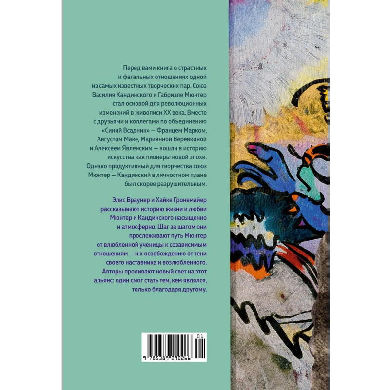 Элис Браунер и Хайке Гронемайер насыщенно и атмосферно рассказывают о встрече, жизни и разрыве одной из самых известных пар в искусстве ХХ века — Василия Кандинского и Габриэле Мюнтер. Этот союз, продуктивный для творчества, в личностном плане был разрушительным. Габриэле пришлось пройти путь от влюбленной ученицы через созависимые отношения к освобождению от тени своего наставника и возлюбленного. Соавторы показывают, какую роль талантливая и трудолюбивая Габриэле Мюнтер сыграла в открытиях, осуществленных Кандинским в живописи и теории искусства, а также в создании художественного объединения «Синий всадник». Влияние Мюнтер и других подруг мужчин-художников игнорировалось и коллегами по объединению, и исследователями. Книга вносят это существенное исправление в историю одного из самых ярких явлений в искусстве ХХ века.
