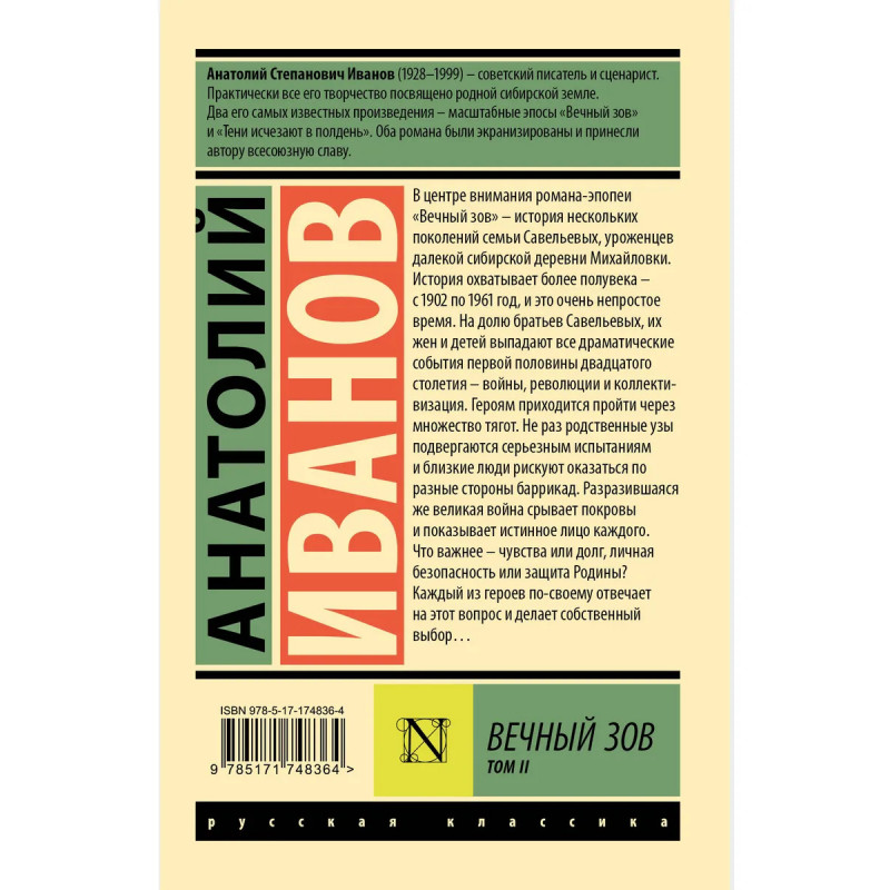 — Масштабный сибирский эпос «Вечный зов» — главное произведение Анатолия Иванова. — В центре сюжета романа — история нескольких поколений семьи Савельевых, уроженцев далекой сибирской деревни Михайловка. — Многосерийная экранизация «Вечного зова» стала одним из самых культовых сериалов советского телевидения. — В это издание вошел второй том романа, охватывающий период с 1942 по 1961 год. — Издание в серии «Эксклюзив: Русская классика» — в удобном карманном формате и узнаваемом оформлении.