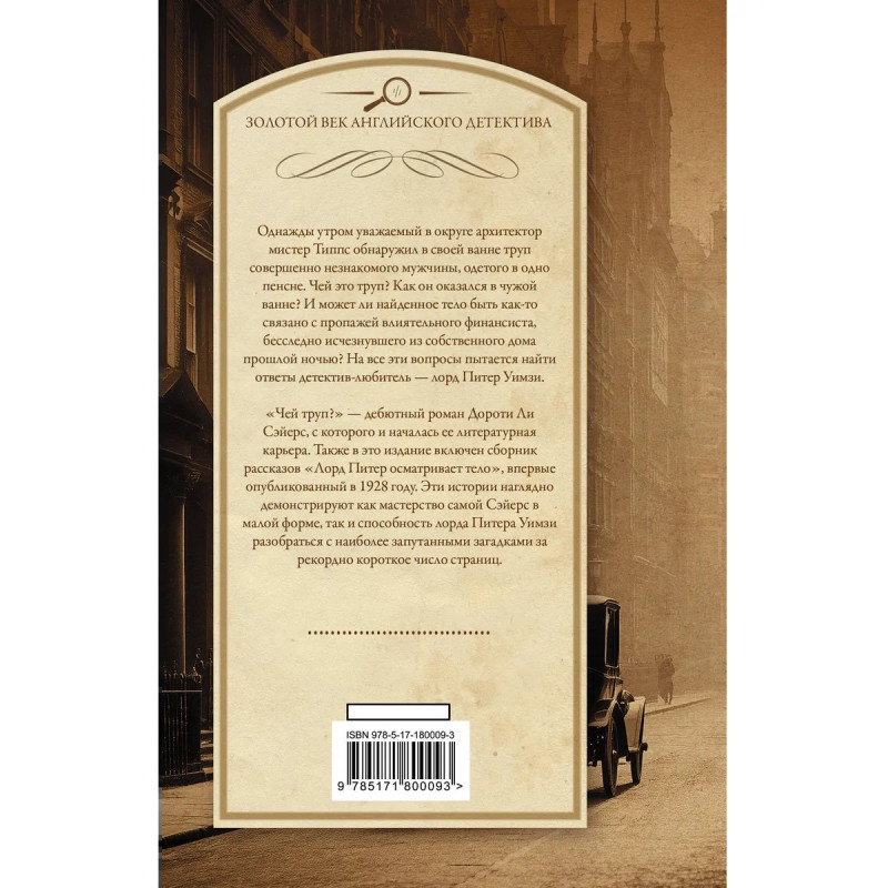 — В двадцатые–тридцатые годы прошлого века Дороти Ли Сэйерс вместе с Агатой Кристи, Марджери Аллингем и Найо Марш относили к числу четырех королев английского детектива. — Лорд Питер Уимзи — один из самых известных литературных детективов. Его популярность была так велика, что даже известный писатель Стивен Кинг на заре карьеры предпринял попытку написать роман об очередном расследовании лорда-детектива. — «Чей труп» — дебютный роман Дороти Ли Сэйерс и первая книга о расследованиях лорда Питера Уимзи. — Все книги о Питере Уимзи обладают завершенными самостоятельными сюжетами и могут читаться по отдельности. — Также в данное издание вошло 12 рассказов, в которых также фигурирует лорд Питер Уимзи.