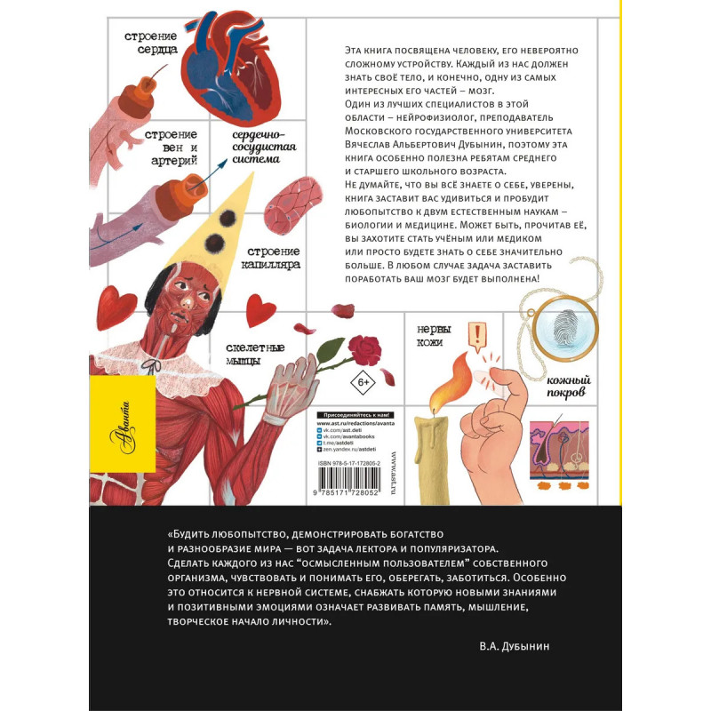 Книга замечательных ученых и популяризаторов науки Вячеслава Дубынина и Игоря Сергеева расскажет юному читателю о самом интересном на свете - о человеке. Изучать тело и мозг человека школьникам помогут и лекции Вячеслава Дубынина, ссылки на которые в виде QR-кодов представлены в книге. Для среднего и старшего школьного возраста.