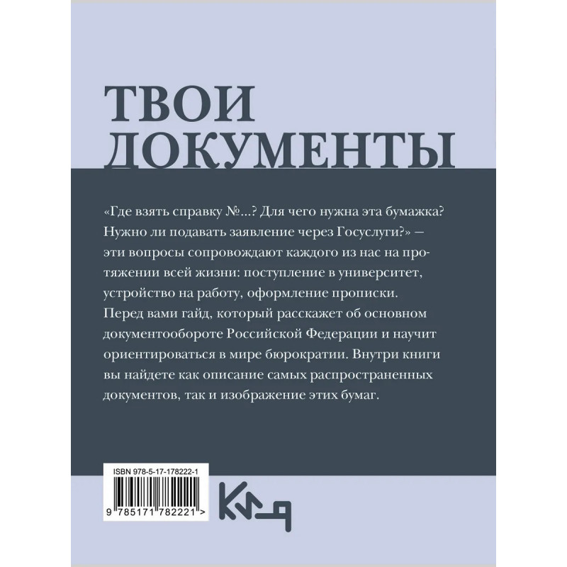 «Где взять справку №…? Для чего нужна эта бумажка? Нужно ли подавать заявление через Госуслуги?» — эти вопросы сопровождают каждого из нас на протяжении всей жизни: поступление в университет, устройство на работу, оформление прописки. Перед вами гайд, который расскажет об основном документообороте Российской Федерации и научит ориентироваться в мире бюрократии. Внутри книги вы найдете как описание самых распространенных документов, так и изображение этих бумаг.