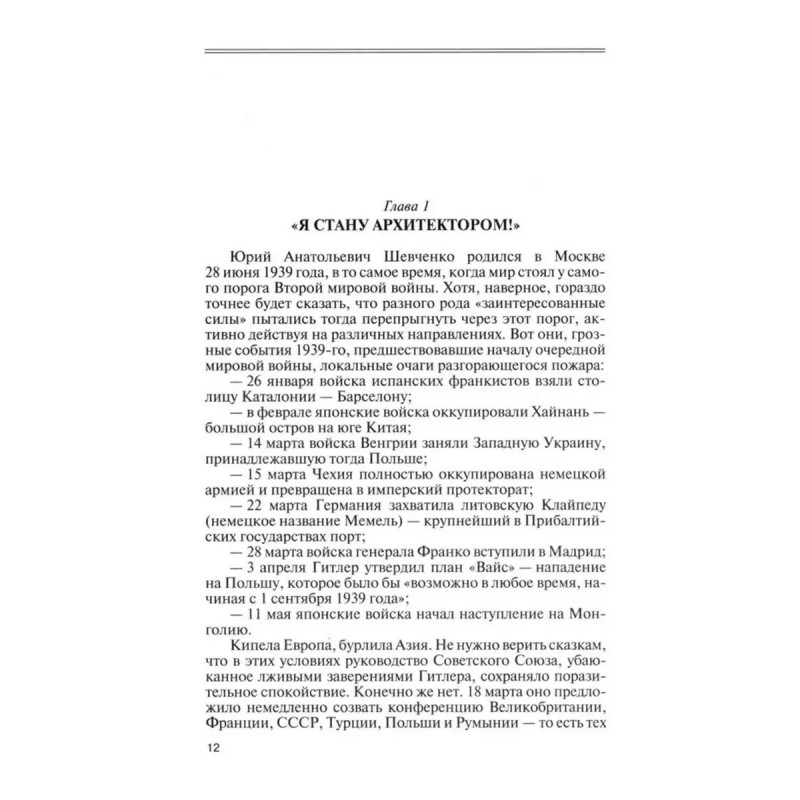 Перед Юрием Шевченко, последним сталинским и первым ленинским стипендиатом Московского архитектурного института, открывались блестящие профессиональные перспективы, однако, совершенно неожиданно, он был приглашён на службу в разведку. Нелегал «Джеймс», по легенде — французский художник и архитектор, работал приблизительно в девяноста странах всех обитаемых континентов. Полученные им документы — преимущественно высших степеней секретности — составляют порядка трёхсот томов архивного дела, и он считается одним из наиболее эффективных советских и российских нелегальных разведчиков. В 2001 году было принято решение о прекращении активной разведывательной деятельности Юрия Анатольевича за рубежом, а в 2017 году ему было присвоено звание Героя Российской Федерации. Имя Шевченко стало известно широкой общественности только в 2020 году — немногим менее чем за год до его ухода. В книге впервые представлены рассекреченные фрагменты из оперативных документов СВР.