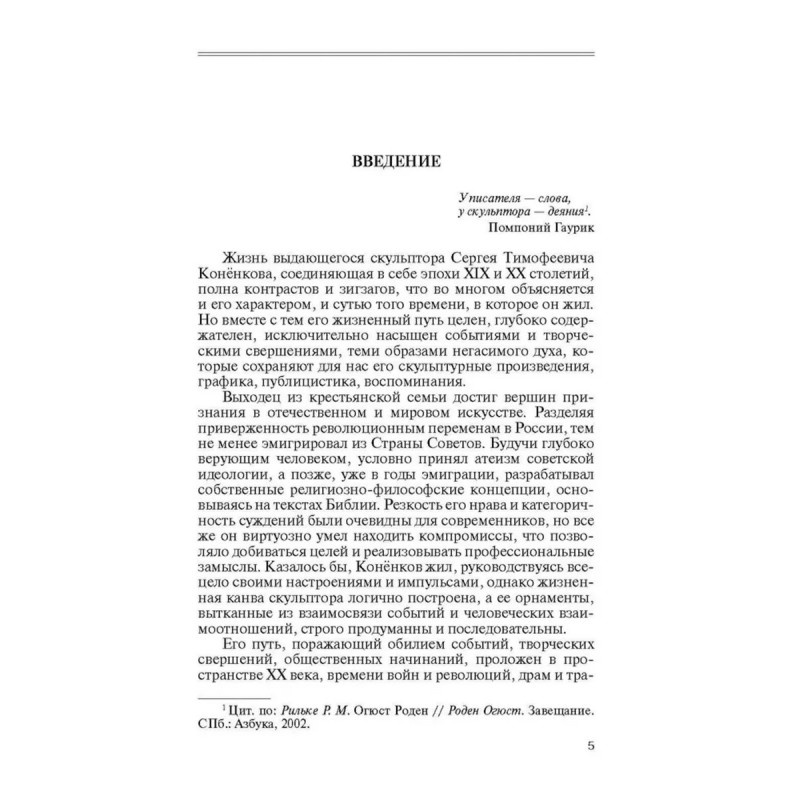Жизнь выдающегося скульптора Сергея Тимофеевича Конёнкова, соединяющая в себе эпохи XIX и ХХ столетий, полна контрастов и зигзагов, что во многом объясняется и его характером, и сутью того времени, в которое он жил. Но вместе с тем его жизненный путь целен, глубоко содержателен, богат событиями и творческими свершениями, теми образами негасимого духа, которые сохраняют для нас его скульптурные произведения, графика, публицистика, воспоминания. Выходец из крестьянской семьи, он достиг вершин признания в отечественном и мировом искусстве. ХХ век поистине стал его веком, насыщенным различными стилистическими направлениями и творческими экспериментами, на которые чутко откликался скульптор. Он был, несомненно, подвижником духа, как и каждый художник столь высокого профессионального уровня и глубинной философии творчества.