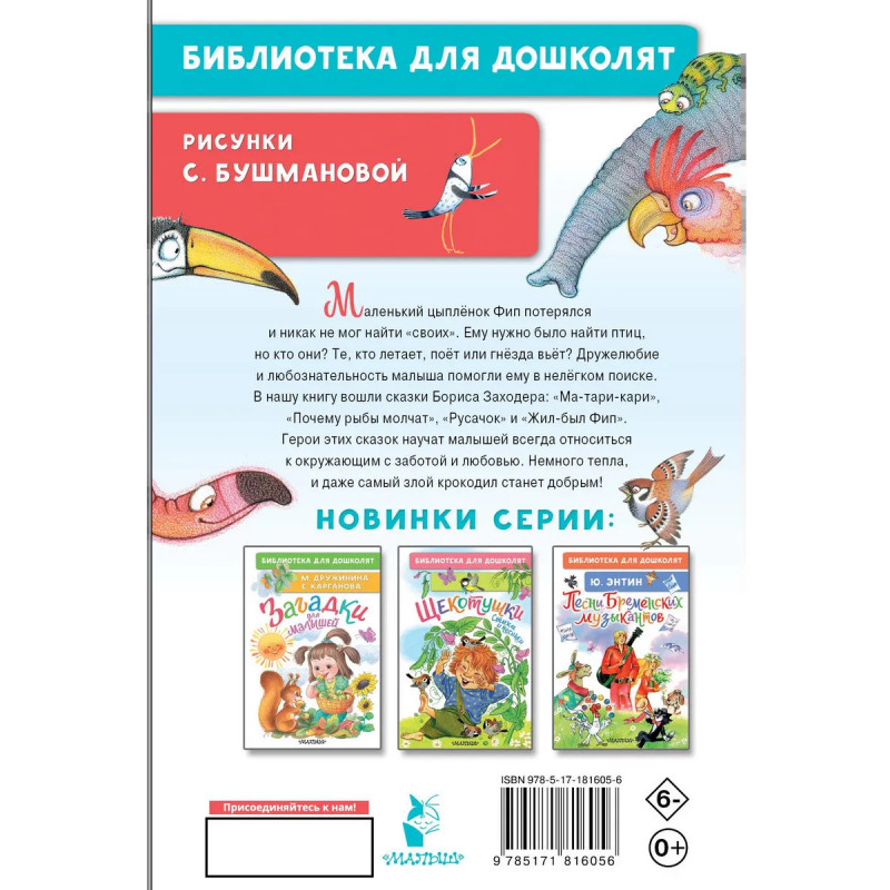 Маленький цыплёнок Фип потерялся и никак не мог найти «своих». Ему нужно было найти птиц, но кто они? Те, кто летает, поёт или гнёзда вьёт? Дружелюбие и любознательность малыша помогли ему в нелёгком поиске. В нашу книгу вошли сказки Бориса Заходера: «Ма-тари-кари», «Почему рыбы молчат», «Русачок» и «Жил-был Фип». Герои этих сказок научат малышей всегда относиться к окружающим с заботой и любовью. Немного тепла, и даже самый злой крокодил станет добрым!