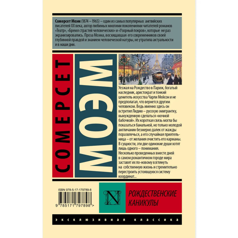 — Автор романов «Луна и шесть пенсов», «Театр», «Бремя страстей человеческих» Сомерсет Моэм — один из самых значимых английских писателей первой половины XX века. — Экранизированные в 1944 году «Рождественские каникулы» — одно из самых необычных произведений Моэма, это трогательная и трагическая история искренней и всепрощающей любви и бесконечного одиночества. — Роман в классическом переводе Раисы Ефимовны Облонской. — Издание в серии «Эксклюзивная классика» — в удобном карманном формате и узнаваемом оформлении.