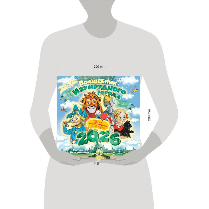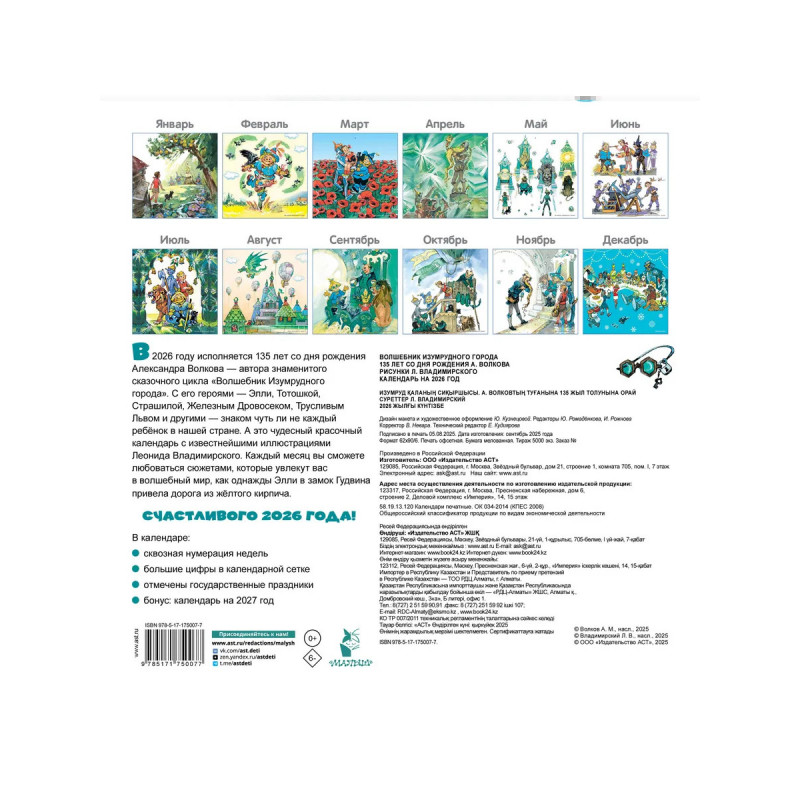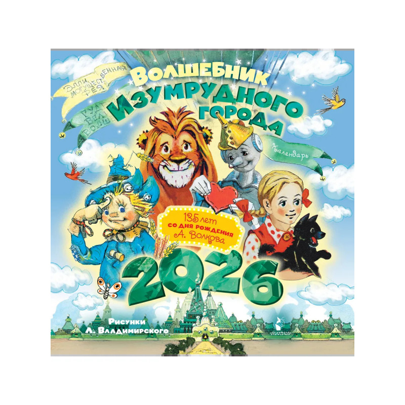 В 2026 году исполняется 135 лет со дня рождения Александра Волкова — автора знаменитого сказочного цикла «Волшебник Изумрудного города», состоящего из шести повестей: "Волшебник Изумрудного города", "Урфин Джюс и его деревянные солдаты", "Семь подземных королей", "Огненный бог Марринов", "Желтый Туман", "Тайна заброшенного замка". А это - чудесный красочный календарь с известнейшими иллюстрациями Леонида Владимирского к некоторым из них. Каждый месяц вы сможете любоваться сюжетами, которые увлекут вас в волшебный мир, как однажды Элли в замок Гудвина привела дорога из жёлтого кирпича. Счастливого 2026 года! В календаре: сквозная нумерация недель большие цифры в календарной сетке отмечены государственные праздники бонус: календарь на 2027 год.