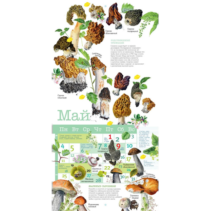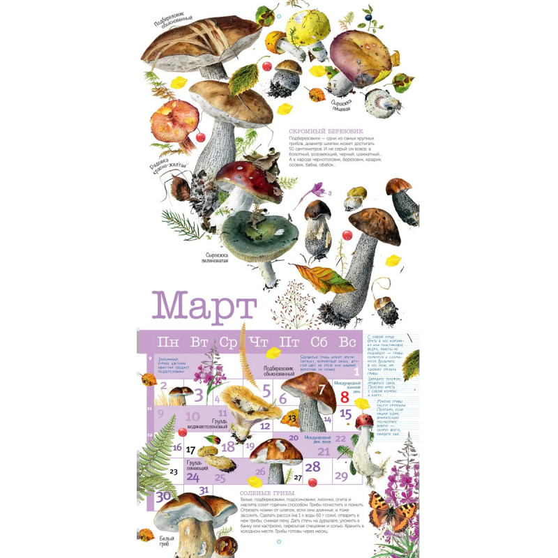 В календаре представлены замечательные иллюстрации Александра Вязьменского, художника, который рисует грибы с натуры, создавая удивительные грибные "букеты". В календарь включены съедобные и несъедобные грибы, встречающиеся в России и знакомые отечественным грибникам. Интересная информация, любопытные факты, народные приметы о грибах - все это вы найдете на страницах нашего календаря. В низу календарной сетки размещены кулинарные рецепты, которые позволят вам приготовить разнообразные блюда из грибов.