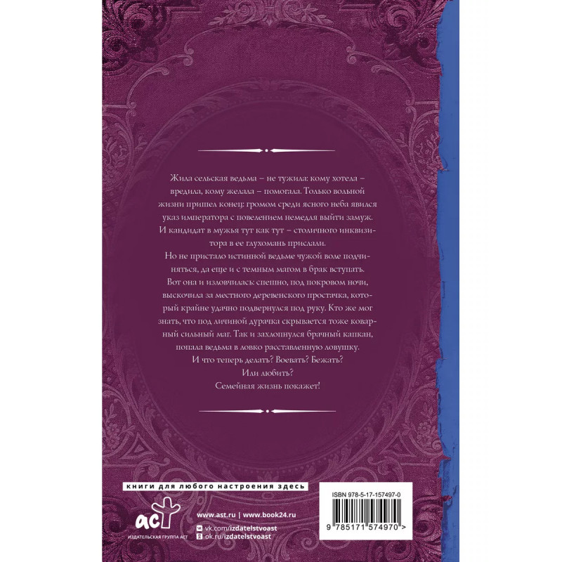 Брачный капкан для ведьмы. Жила сельская ведьма - не тужила: кому хотела - вредила, кому желала - помогала. Только вольной жизни пришел конец: громом среди ясного неба явился указ императора с повелением немедля выйти замуж. И кандидат в мужья тут как тут - столичного инквизитора в ее глухомань прислали. Но не пристало истинной ведьме чужой воле подчиняться, да еще и с темным магом в брак вступать. Вот она и изловчилась: спешно, под покровом ночи, "выскочила" за местного деревенского простачка, который крайне удачно подвернулся под руку. Кто же мог знать, что под личиной дурачка скрывается тоже коварный сильный маг. Так и захлопнулся брачный капкан, попала ведьма в ловко расставленную ловушку. И что теперь делать? Воевать? Бежать? Или любить? Семейная жизнь покажет!