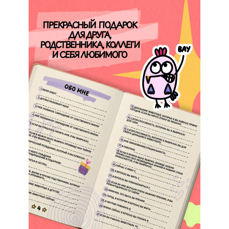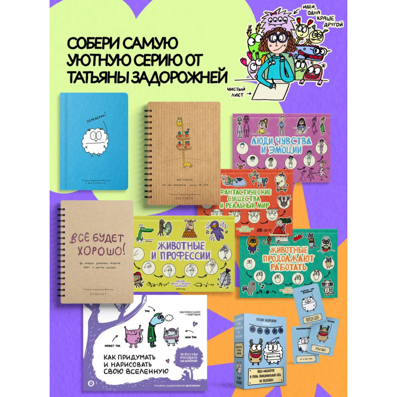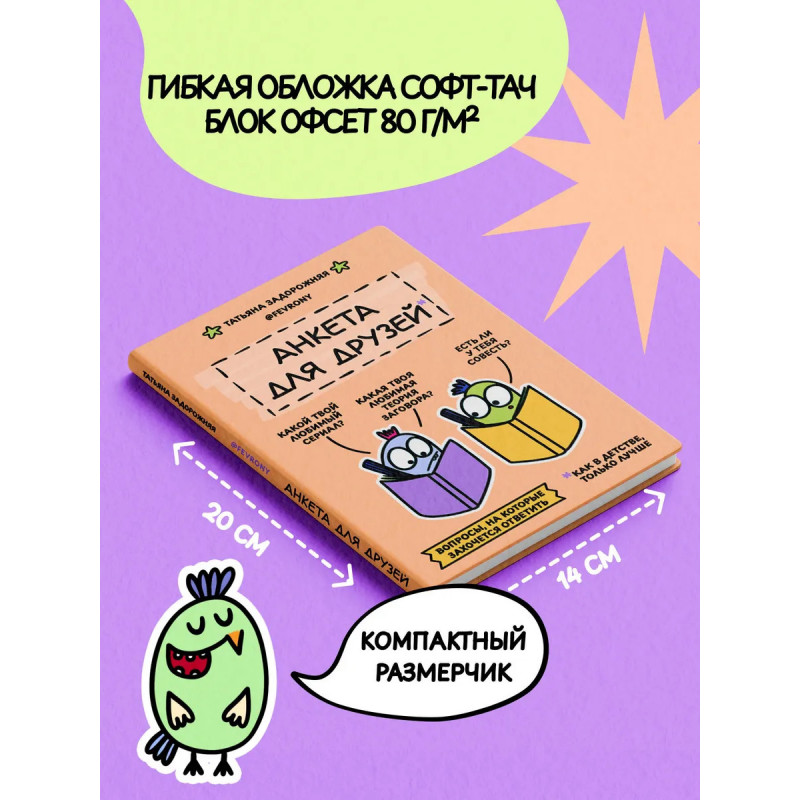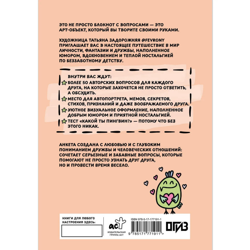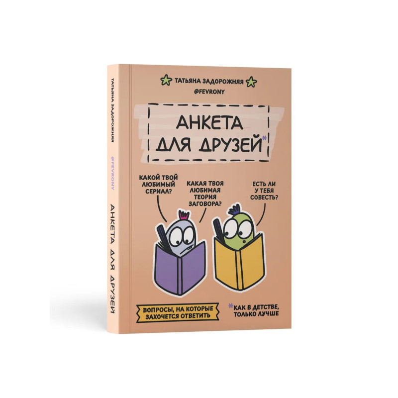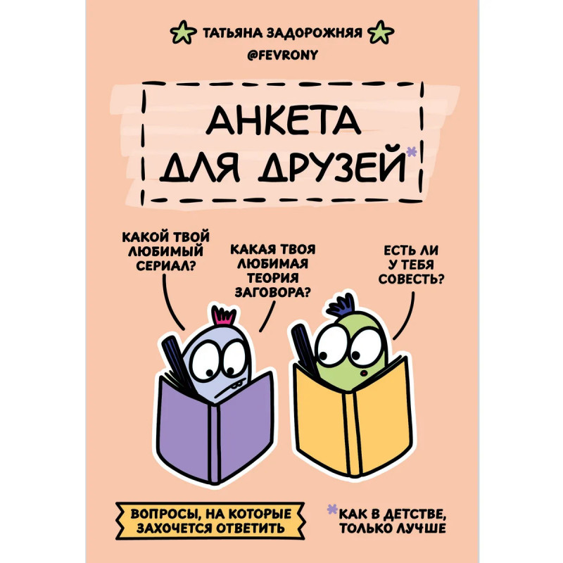 Вы держите в руках не просто блокнот с вопросами. Художница Татьяна Задорожняя fevrony приглашает вас в настоящее путешествие в мир личности, фантазии и дружбы, наполненное юмором, вдохновением и теплой ностальгией по беззаботному детству.