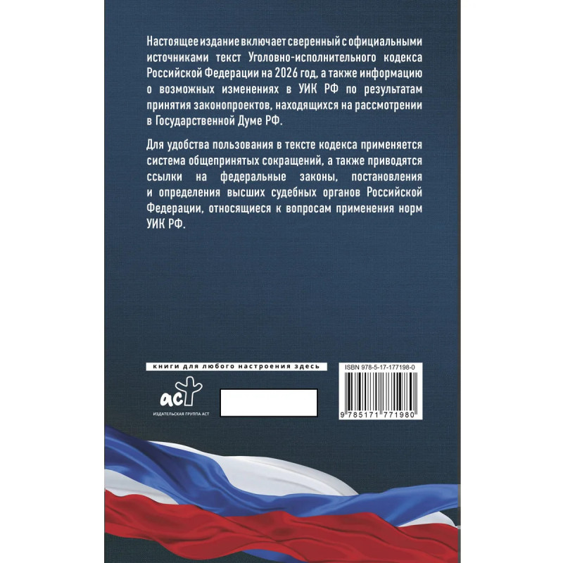 Данное издание Уголовно-исполнительного кодекса РФ сверено с официальным источником и приводится по состоянию на 2026 год. Кодекс учитывает все изменения, опубликованные в официальных источниках на момент подписания издания в печать. В издании представлена информация о возможных изменениях в УИК РФ по результатам принятия законопроектов, находящихся на рассмотрении в Государственной Думе РФ. Для удобства пользования в тексте кодекса применяется система общепринятых сокращений, а также приводятся ссылки на федеральные законы, постановления Правительства Российской Федерации, постановления и определения высших судебных органов Российской Федерации, относящиеся к вопросам применения норм УИК РФ.