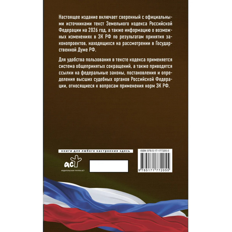 Данное издание Земельного кодекса РФ сверено с официальным источником и приводится по состоянию на 2026 год. Кодекс учитывает все изменения, опубликованные в официальных источниках на момент подписания издания в печать. В издании представлена информация о возможных изменениях в ЗК РФ по результатам принятия законопроектов, находящихся на рассмотрении в Государственной Думе РФ. Для удобства пользования в тексте кодекса применяется система общепринятых сокращений, а также приводятся ссылки на федеральные законы, постановления Правительства Российской Федерации, постановления и определения высших судебных органов Российской Федерации, относящиеся к вопросам применения норм ЗК РФ.