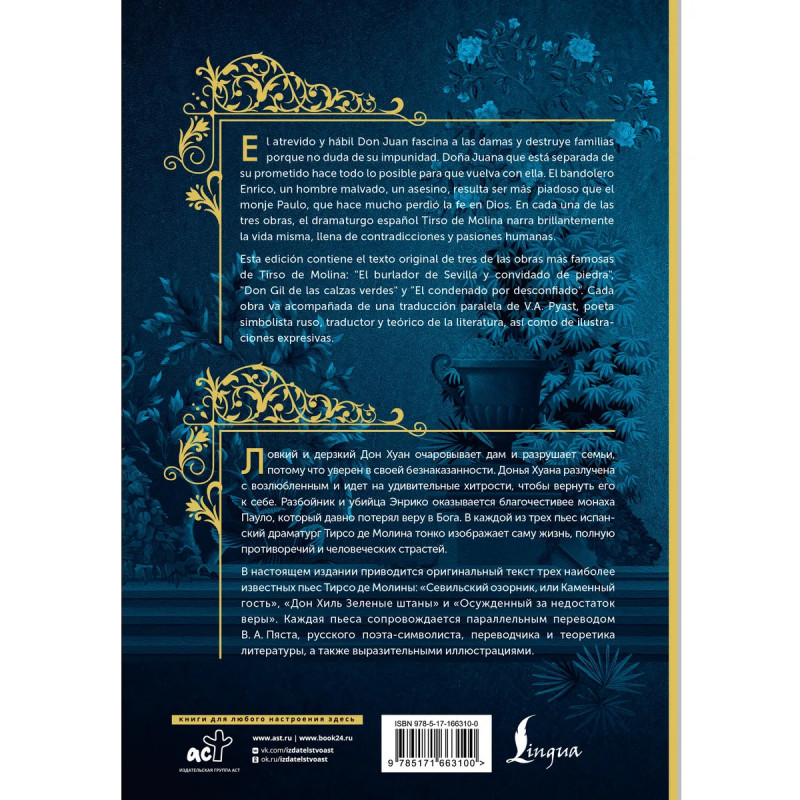 В настоящем издании приводится оригинальный текст трех наиболее известных пьес Тирсо де Молины: "Севильский озорник, или каменный гость", "Дон Хиль Зеленые штаны" и "Осужденный за недостаток веры". Каждая пьеса сопровождается параллельным переводом В. А. Пяста, русского поэта-символиста, переводчика и теоретика литературы, а также выразительными иллюстрациями.