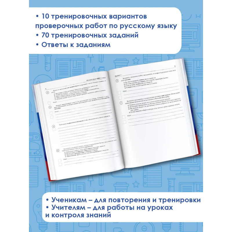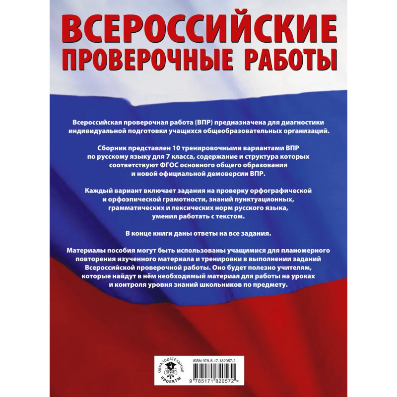 Пособие предназначено для подготовки учащихся 7 классов общеобразовательных организаций к Всероссийской проверочной работе. Сборник включает 10 тренировочных вариантов работ, которые по своему содержанию соответствуют Федеральному государственному образовательному стандарту основного общего образования. Каждый вариант содержит задания на проверку орфографической, орфоэпической, пунктуационной и языковой грамотности, умения работать с текстом. В конце книги даны ответы на все задания. Пособие может быть использовано как для самостоятельных занятий семиклассников, так и для аудиторной работы под руководством педагога.