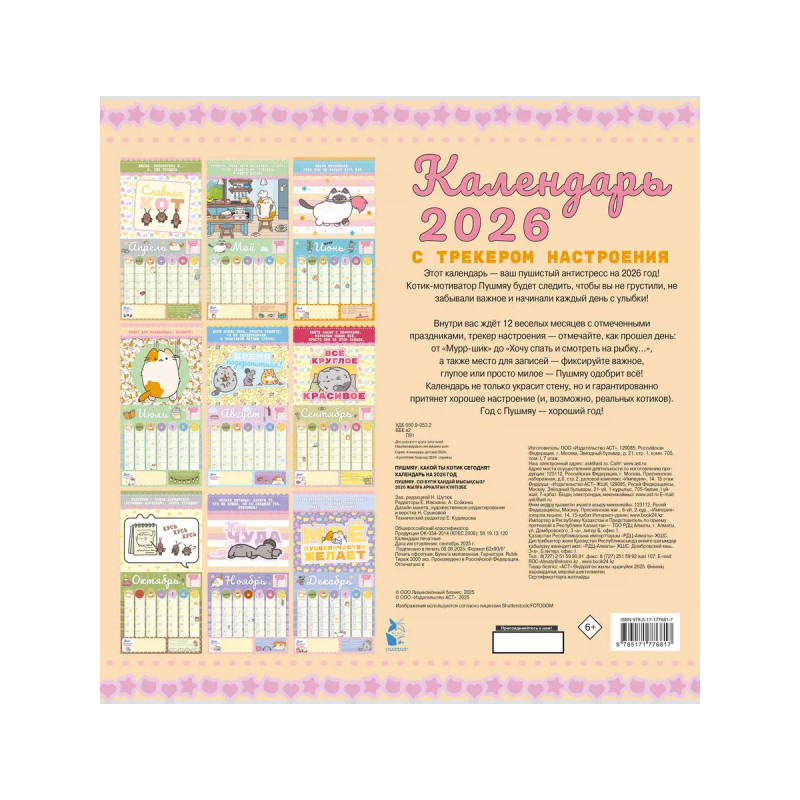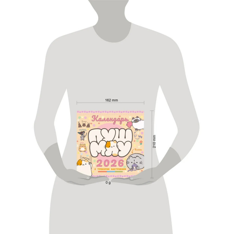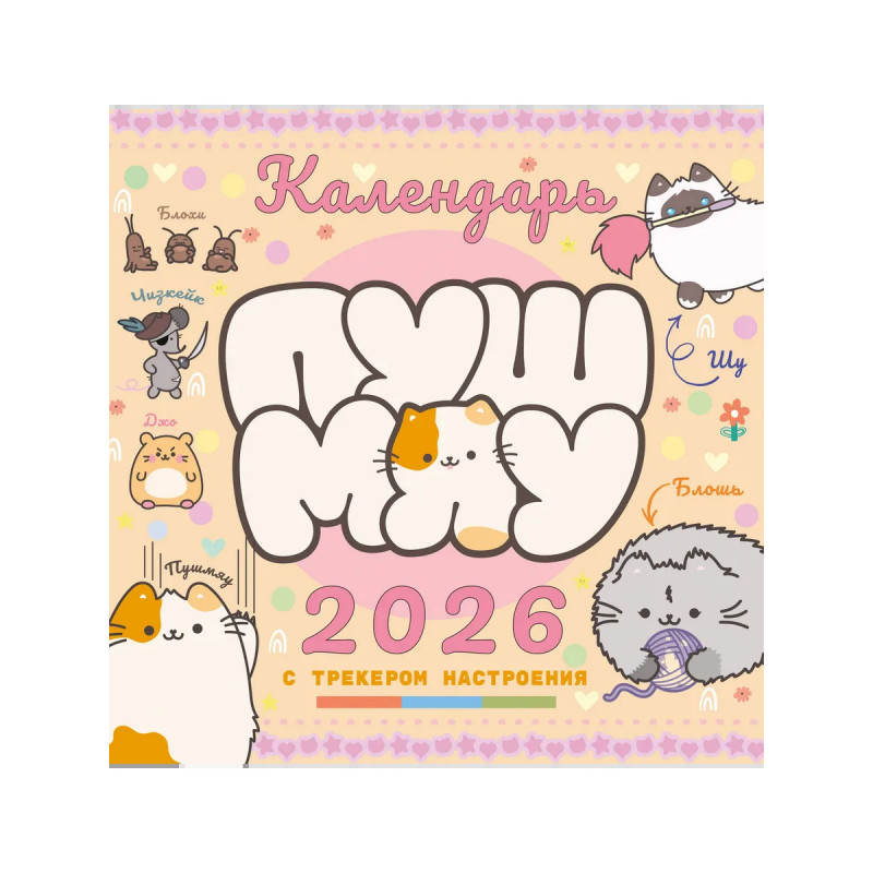 Этот календарь – ваш пушистый антистресс на 2026 год! Котик-мотиватор Пушмяу будет следить, чтобы вы не грустили, не забывали важное и начинали каждый день с улыбки! Внутри вас ждёт 12 веселых месяцев с отмеченными праздниками, трекер настроения – отмечайте, как прошел день: от "Мурр-шик" до "Хочу спать и смотреть на рыбку…", а также место для записей – фиксируйте важное, глупое или просто милое – Пушмяу одобрит всё! Календарь не только украсит стену, но и гарантированно притянет хорошее настроение (и, возможно, реальных котиков). Год с Пушмяу – хороший год!