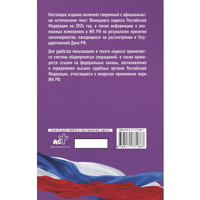 Данное издание Жилищного кодекса РФ сверено с официальным источником и приводится по состоянию на 2026 год. Кодекс учитывает все изменения, опубликованные в официальных источниках на момент подписания издания в печать. В издании представлена информация о возможных изменениях в ЖК РФ по результатам принятия законопроектов, находящихся на рассмотрении в Государственной Думе РФ. Для удобства пользования в тексте кодекса применяется система общепринятых сокращений, а также приводятся ссылки на федеральные законы, постановления Правительства Российской Федерации, постановления и определения высших судебных органов Российской Федерации, относящиеся к вопросам применения норм ЖК РФ.