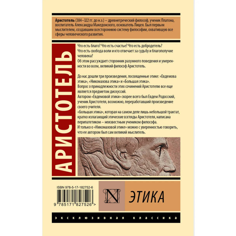 – «Этика» Аристотеля отвечает на простые и одновременно самые сложные вопросы: что такое счастье, добро и справедливость, какова роль характера и привычек, где проходит граница личной свободы и ответственности за свою жизнь. – «Никомахова этика» показывает путь к достойной и «хорошей» жизни: счастье мыслится не как удача или удовольствие, а как деятельность души в согласии с добродетелью; добродетели вырабатываются в действии и всегда находятся между разрушительными крайностями. – Для современного читателя этот текст интересен тем, что философ говорит не о отвлеченной добродетели, а о вполне узнаваемых ситуациях: о воспитании, дружбе, мужестве, справедливости, удовольствиях и смысле политической жизни. – Книга в серии «Эксклюзивная классика» подойдет тем, кто хочет иметь под рукой базовый корпус текстов по этике, на который до сих пор ссылаются курсы по философии, политологии и гуманитарным наукам.
