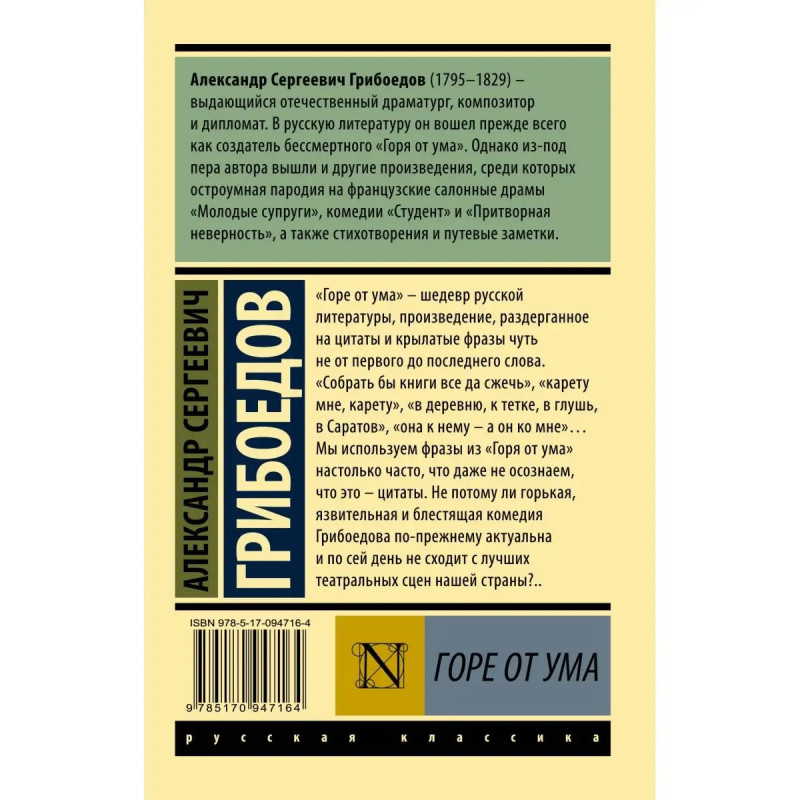 "Горе от ума" шедевр русской литературы, произведение, раздерганное на цитаты и крылатые фразы чуть не от первого до последнего слова. "Собрать бы книги все да сжечь", "карету мне, карету", "в деревню, к тетке, в глушь, в Саратов", "она к нему а он ко мне" Мы используем фразы из "Горя от ума" настолько часто, что даже не осознаем, что это цитаты. Не потому ли горькая, язвительная и блестящая комедия Грибоедова по-прежнему актуальна и по сей день не сходит с лучших театральных сцен нашей страны?..