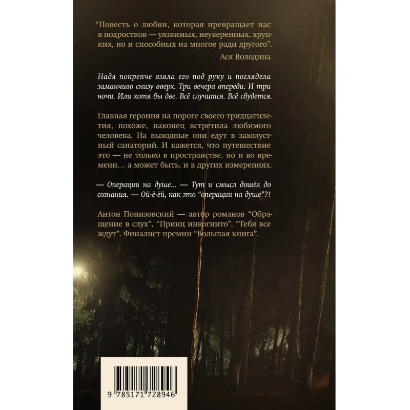– Новинка серии современной прозы «Классное чтение». – Антон Понизовский — писатель, автор произведений «Обращение в слух», «Принц Инкогнито», «Тебя все ждут», финалист премии «Большая книга». – «Женская проза» в парадоксальном мужском исполнении, лирика с элементами фантастики (или сказки). На пороге тридцатилетия героиня, похоже, наконец встретила любимого человека. На выходные они едут в загородный санаторий, и оказывается, что путешествие это — не только в пространстве, но и во времени… а может быть, и в иных измерениях. – Читайте другие книги серии: «Свечи Апокалипсиса»Татьяны Замировской, «Лев и Корица»ЮрияБуйды, Imagine ДмитрияДанилова.
