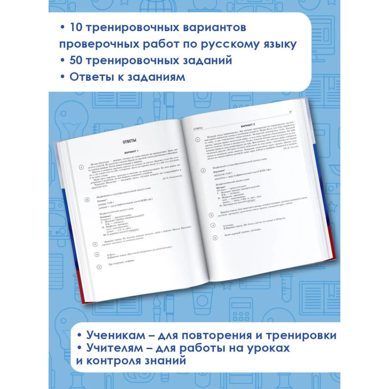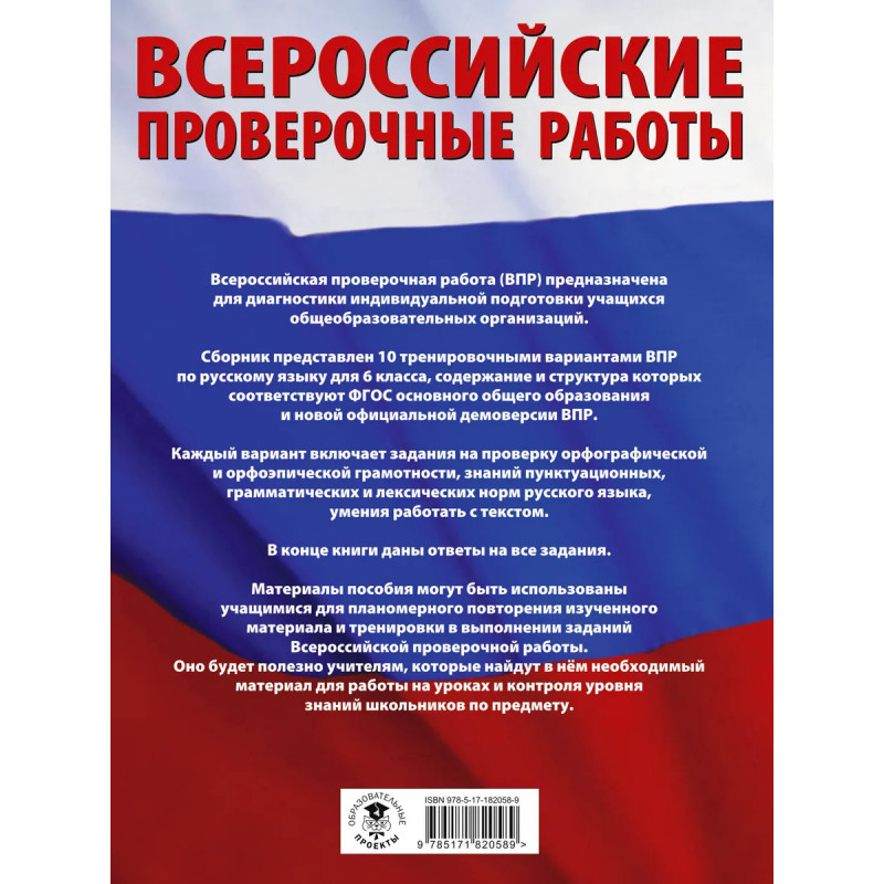 Пособие предназначено для самостоятельной подготовки учащихся 6 классов общеобразовательных организаций к Всероссийской проверочной работе по русскому языку. Сборник включает 10 тренировочных вариантов работы, которые по своему содержанию полностью соответствуют Федеральному государственному образовательному стандарту основного общего образования. Каждый вариант включает задания на проверку орфографической и орфоэпической грамотности, знаний пунктуационных, грамматических и лексических норм русского языка, умений работать с текстом. В конце книги даны ответы на все задания и критерии оценивания их выполнения. Пособие может быть использовано учителями для аудиторной работы в классе.