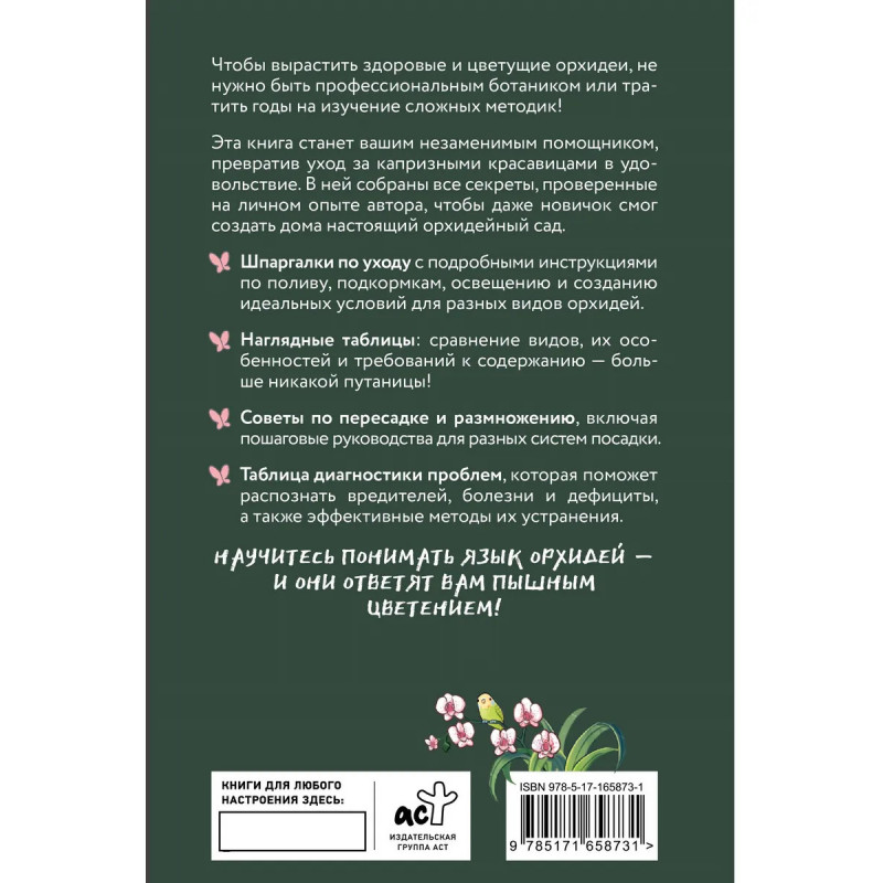 Чтобы вырастить здоровые и цветущие орхидеи, не нужно быть профессиональным ботаником или тратить годы на изучение сложных методик! Эта книга станет вашим незаменимым помощником, превратив уход за капризными красавицами в удовольствие. В ней собраны все секреты, проверенные на личном опыте автора, чтобы даже новичок смог создать дома настоящий орхидейный сад. В книге вы найдете: • Шпаргалки по уходу с подробными инструкциями по поливу, подкормкам, освещению и созданию идеальных условий для разных видов орхидей. • Наглядные таблицы: сравнение видов, их особенностей и требований к содержанию — больше никакой путаницы! • Советы по пересадке и размножению, включая пошаговые руководства для разных систем посадки. • Таблица диагностики проблем, которая поможет распознать вредителей, болезни и дефициты, а также эффективные методы их устранения. Научитесь понимать язык орхидей — и они ответят вам пышным цветением!