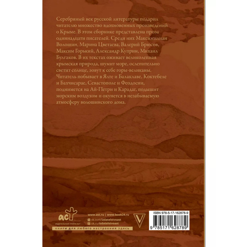 Серебряный век русской литературы подарил читателю множество вдохновенных произведений о Крыме. В этом сборнике представлена проза одиннадцати писателей. Среди них Максимилиан Волошин, Марина Цветаева, Валерий Брюсов, Максим Горький, Александр Куприн, Михаил Булгаков. В их текстах оживает великолепная крымская природа, шумит море, ослепительно светит солнце, зовут к себе горы-великаны. Читатель побывает в Ялте и Балаклаве, Коктебеле и Бахчисарае, Севастополе и Феодосии, поднимется на Ай-Петри и Карадаг, подышит морским воздухом и окунется в незабываемую атмосферу волошинского дома.