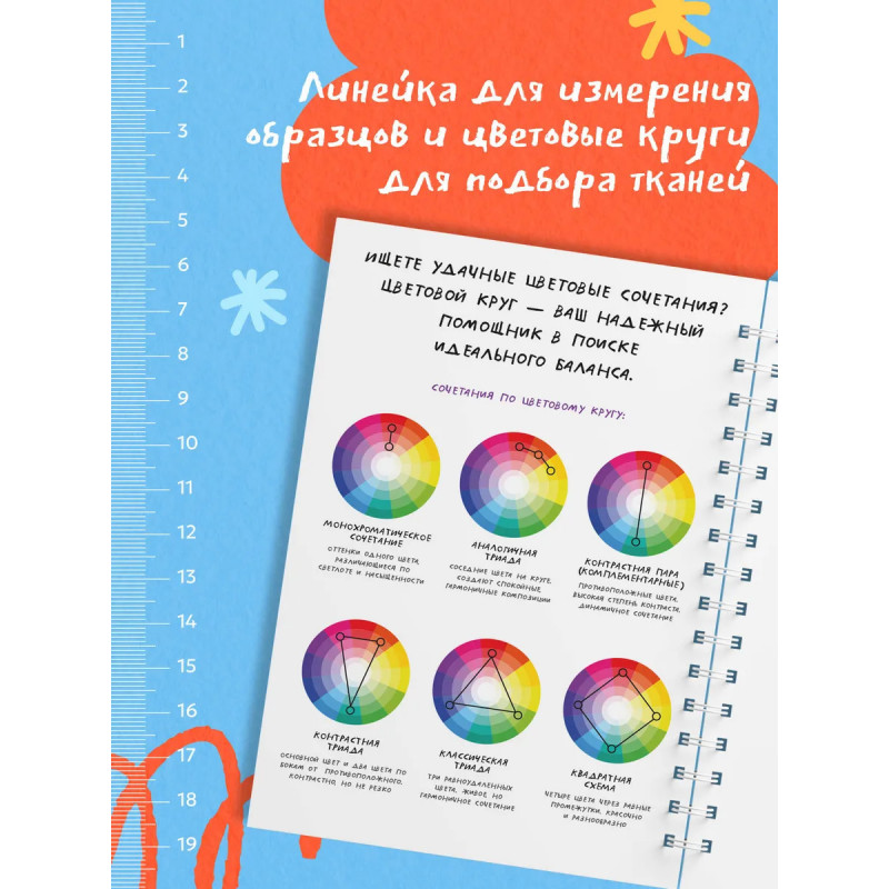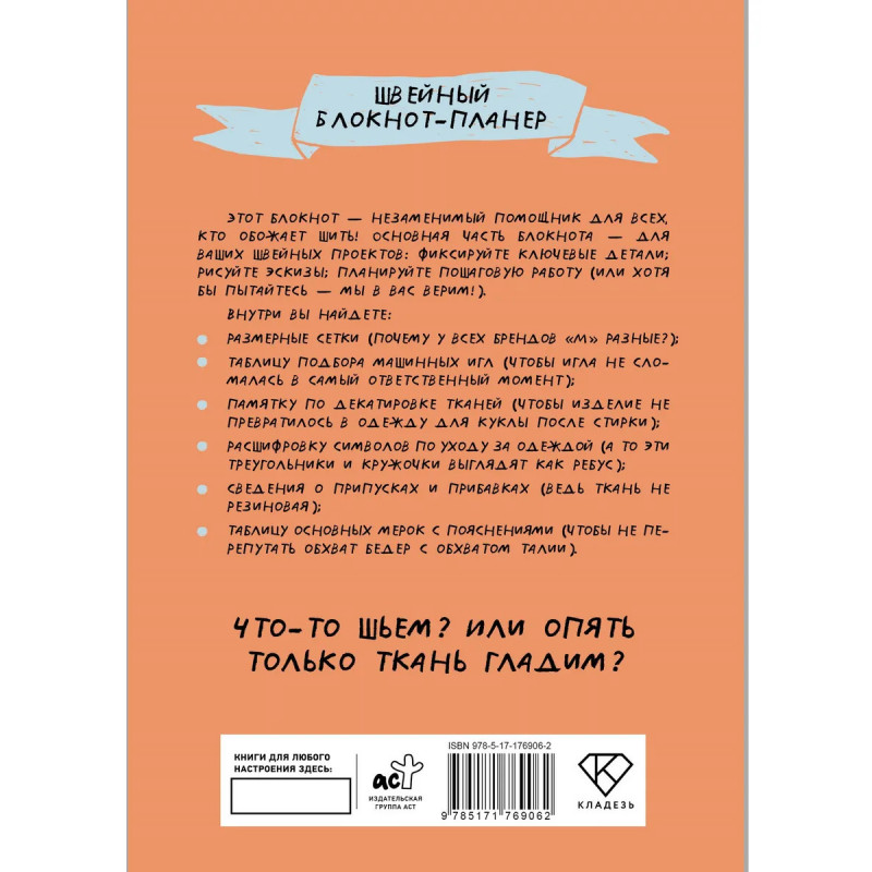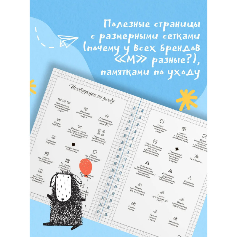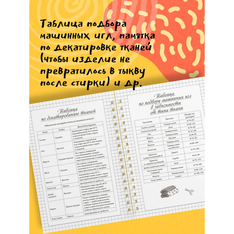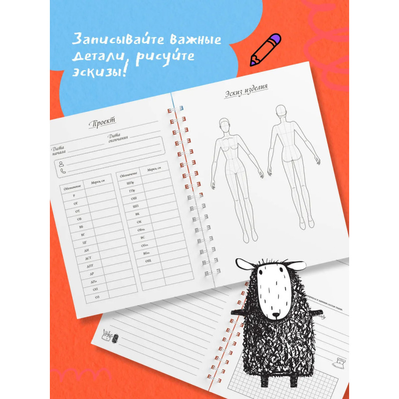 Этот блокнот станет незаменимым помощником для всех, кто увлечен шитьем. Он поможет держать под рукой все идеи, планировать новые проекты и превращать процесс работы в удовольствие. В блокноте предусмотрены специальные страницы для записи проектов, где можно зафиксировать все важные детали: записать мерки, нарисовать эскиз, составить удобный план пошива. Также внутри вы найдете: размерные сетки для женщин, мужчин и детей; список основных мерок с пояснениями; таблицу подбора машинных игл; памятку по декатировке тканей; расшифровку символов по уходу за одеждой; сведения о припусках и прибавках.