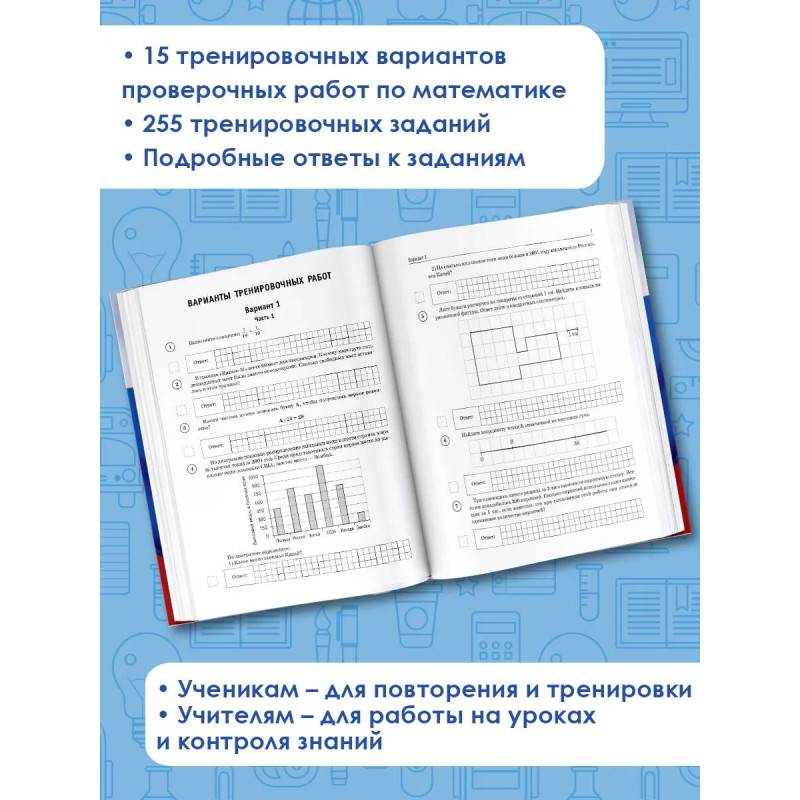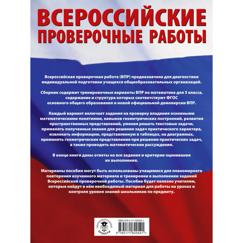 Данное пособие предназначено для учащихся 5-х классов общеобразовательных организаций. Оно позволяет в кратчайшие сроки проверить свои знания, потренироваться в выполнении заданий и тем самым успешно подготовиться к выполнению Всероссийской проверочной работы по математике по итогам обучения в 5-м классе. Пособие содержит 15 тренировочных вариантов проверочных работ. Содержание проверочной работы соответствует Федеральному государственному образовательному стандарту основного общего образования. В конце книги даны ответы на все задания, решения и критерии оценивания. Материалы пособия будут полезны учителям, которые найдут в нём материал для работы на уроках и контроля уровня знаний школьников по предмету.