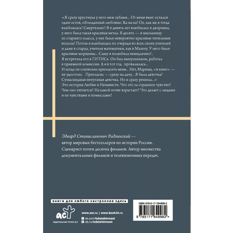 Я сразу хрустнула у него меж зубами... От меня вмиг остался один остов, обглоданный любовью. Ха-ха-ха! Ох, как же я тогда влюблялась! Смертельно! Я в девять лет влюбилась в дворника, у него была такая красивая метла. В десять - в школьницу из старшего класса, у нее были невероятно красивые пепельные волосы! Потом я влюблялась по очереди во всех своих учителей и даже в старца, учителя математики, как в Мазепу. У него были красивые морщины Сашу я полюбила немедленно!.... Я встретила его в ГИТИСе. Он был выпускником, работал в приемной комиссии. А я в тот год провалилась... И когда он соизволил пригласить меня...Нет, Мариша ,"в кино" не удостоил. Пригласил сразу на дачу... Я была девочка! Сумасшедшая непуганая девочка. Но я сразу решила. Это история Любви и Нависти.Что это за страшное чувство? Чем оно питается? На какой почве взрастает? Что делает с людьми и их чувствами и помыслами?