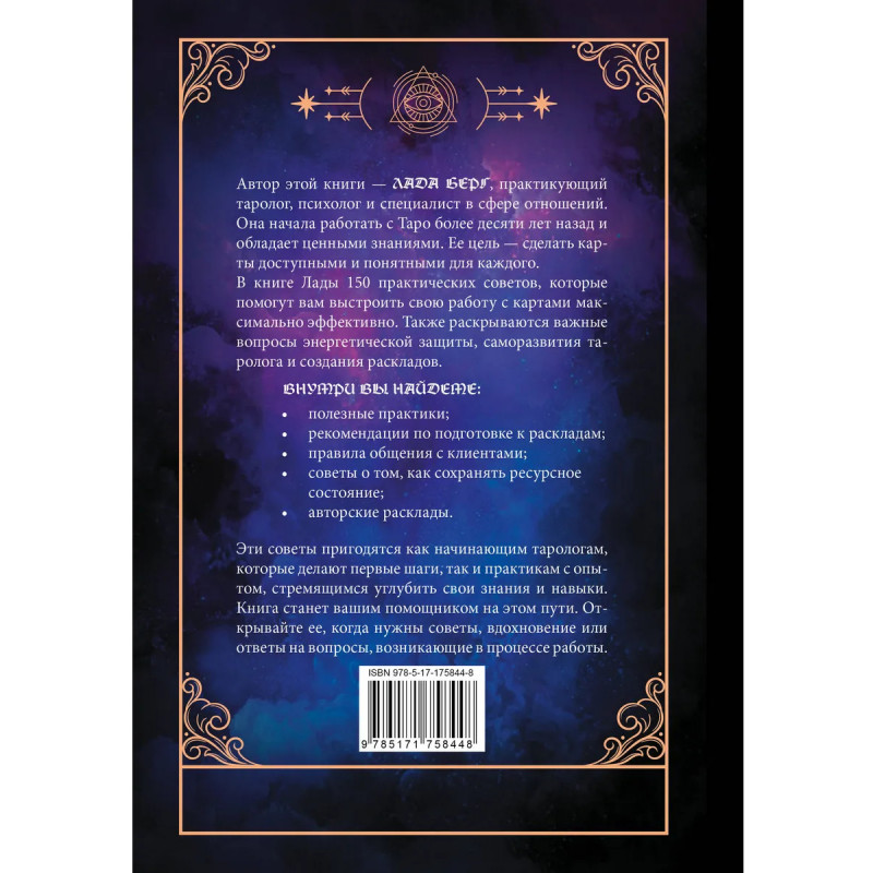 Автор этой книги — ЛАДА БЕРГ, практикующий таролог, психолог и специалист в сфере отношений. Она начала работать с Таро более десяти лет назад и обладает ценными знаниями. Ее цель — сделать карты доступными и понятными для каждого. В книге Лады 150 практических советов, которые помогут выстроить свою работу с картами максимально эффективно. Также раскрываются важные вопросы энергетической защиты, саморазвития таролога и создания раскладов. ВНУТРИ ВЫ НАЙДЕТЕ: • полезные практики; • рекомендации по подготовке к раскладам; • правила общения с клиентами; • советы о том, как сохранять ресурсное состояние; • авторские расклады. Эти советы пригодятся как начинающим тарологам, которые делают первые шаги, так и практикам с опытом, стремящимся углубить свои знания и навыки. Книга станет вашим помощником на этом пути. Открывайте ее, когда нужны советы, вдохновение или ответы на вопросы, возникающие в процессе работы.
