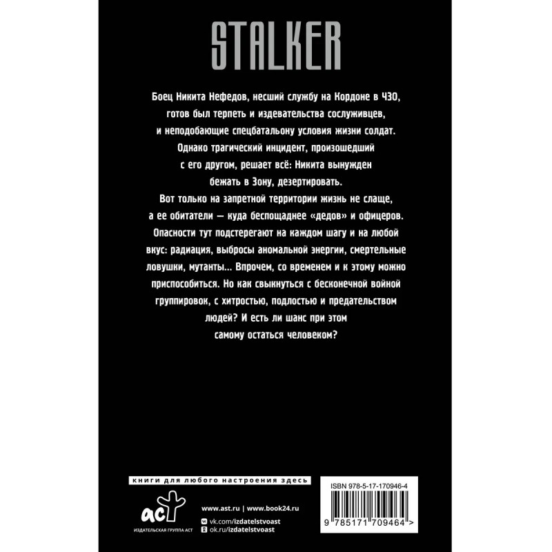Боец Никита Нефедов, несший службу на Кордоне в ЧЗО, готов был терпеть и издевательства сослуживцев, и неподобающие спецбатальону условия жизни солдат. Однако трагический инцидент, произошедший с его другом, решает всё: Никита вынужден бежать в Зону, дезертировать. Вот только на запретной территории жизнь не слаще, а ее обитатели — куда беспощаднее "дедов" и офицеров. Опасности тут подстерегают на каждом шагу и на любой вкус: радиация, выбросы аномальной энергии, смертельные ловушки, мутанты… Впрочем, со временем и к этому можно приспособиться. Но как свыкнуться с бесконечной войной группировок, с хитростью, подлостью и предательством людей? И есть ли шанс при этом самому остаться человеком?