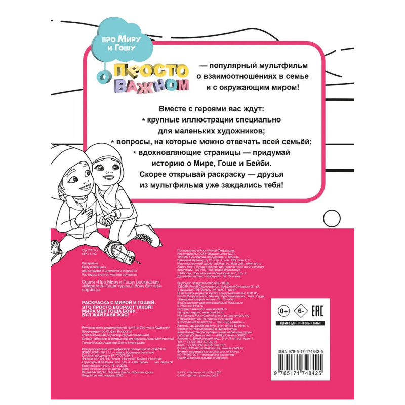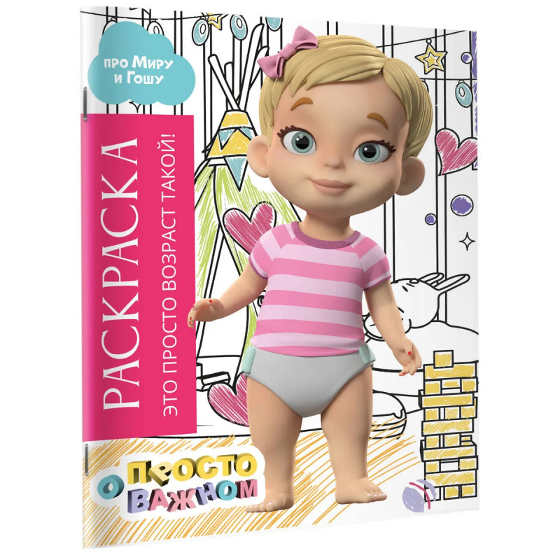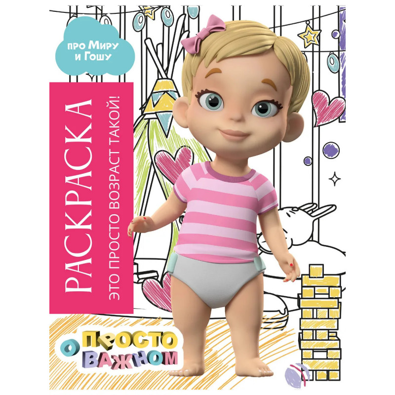 «Просто о важном» — добрый и познавательный мультфильм, который помогает детям и родителям лучше понимать друг друга. Откройте для себя мир красок и творчества вместе с любимыми героями! В этой раскраске вас ждут: · Крупные и чёткие иллюстрации с широким контуром, которые легко и приятно раскрашивать; · Интересные задания и вопросы; · Простор для фантазии: раскрась героев мультфильма так, как хочешь именно ТЫ! Погрузитесь в мир добра, любви и взаимопонимания вместе с Мирой, Гошей, Бейби и их большой дружной семьёй!