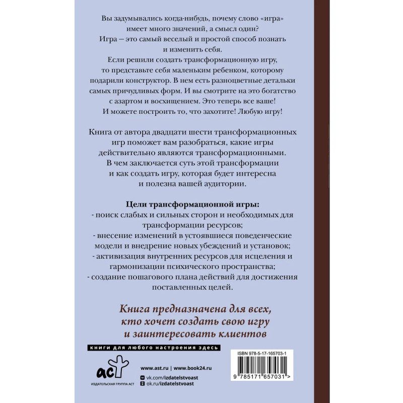 Если решили создать трансформационную игру, то представьте себя маленьким ребенком, которому подарили конструктор. В нем есть разноцветные детальки самых причудливых форм. И вы смотрите на это богатство с азартом и восхищением. Это теперь все ваше! И можете построить то, что захотите! Любую игру! Книга от автора двадцати трансформационных игр поможет вам разобраться, какие игры действительно являются трансформационными. В чем заключается суть этой трансформации, и как создать игру, которая будет интересна и полезна вашей аудитории.