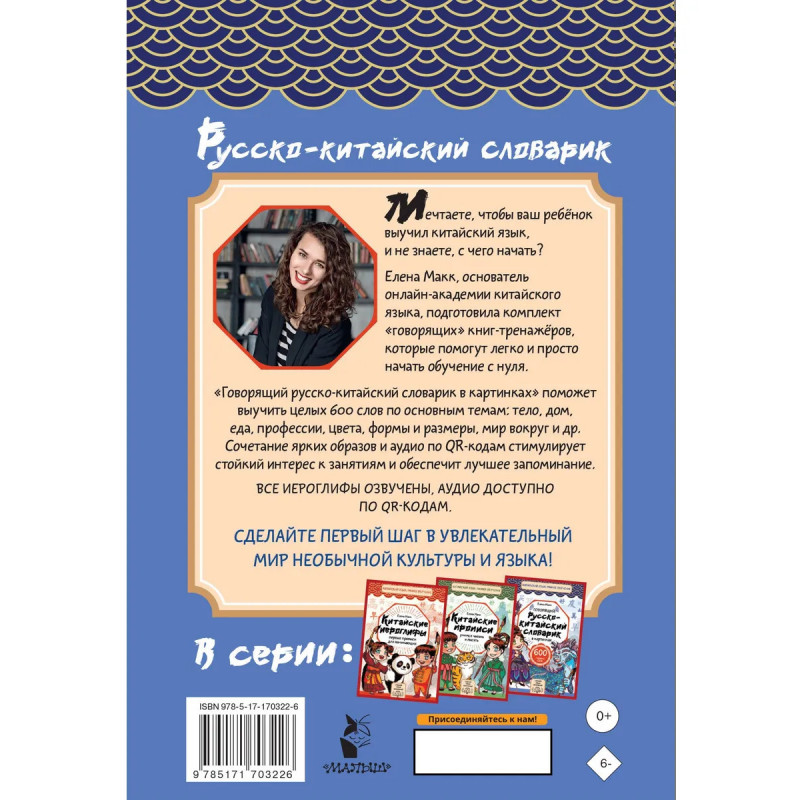 Мечтаете, чтобы ваш ребёнок выучил китайский язык и не знаете с чего начать? Елена Макк, основатель онлайн-академии китайского языка, подготовила комплект «говорящих» книг-тренажёров, которые помогут легко и просто начать обучение с нуля. В комплект входят прописи для тренировки графических навыков и словарик для изучения первых слов. «Говорящий русско-китайский словарик в картинках» поможет выучить более 600 слов по основным темам: тело, дом, еда, профессии, цвета, формы и размеры, мир вокруг и др. Сочетание ярких образов и аудио по QR-кодам стимулирует стойкий интерес к занятиям и обеспечит лучшее запоминание. Сделайте первый шаг в увлекательный мир необычного языка и культуры!