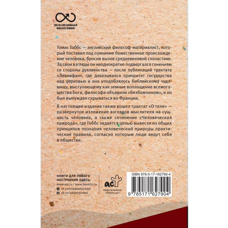 Томас Гоббс английский философ-материалист, который поставил под сомнение божественное происхождение человека, бросив вызов средневековой схоластике. За свои взгляды он неоднократно подвергался гонениям со стороны духовенства после публикации трактата "Левиафан", где доказывался приоритет государства над церковью, и оно уподоблялось библейскому чудовищу, выступающему как земное воплощение всемогущества Бога, философа объявили "безбожником", и он был вынужден скрываться во Франции. В настоящее издание также вошел трактат "О теле" развернутое изложение взглядов мыслителя насущность человека, а также сочинение "Человеческая природа", где Гоббс задается целью вывести из общих принципов познания человеческой природы практические правила, согласно которым люди ведут себя в обществе.