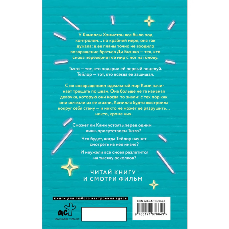 У Камиллы Хэмилтон все было под контролем… по крайней мере, она так думала: в ее планы точно не входило возвращение братьев Ди Бьянко — тех, кто снова перевернет ее мир с ног на голову. Тьяго — тот, кто подарил ей первый поцелуй. Тейлор — тот, кто всегда ее защищал. С их возвращением идеальный мир Ками начинает трещать по швам. Она больше не та наивная девочка, которую они когда-то знали: с тех пор как они исчезли из ее жизни, Камилла будто выстроила вокруг себя стену — и никто не может ее разрушить… никто, кроме них. Сможет ли Ками устоять перед одним лишь присутствием Тьяго? Что будет, когда Тейлор начнет смотреть на нее иначе? И неужели все снова разлетится на тысячу осколков?