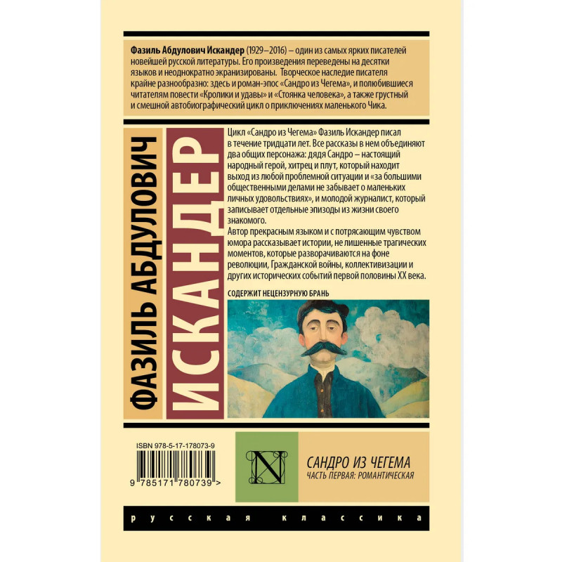 Цикл "Сандро из Чегема" Фазиль Искандер писал в течение тридцати лет. Все рассказы в нем объединяют два общих персонажа: дядя Сандро — настоящий народный герой, хитрец и плут, который находит выход из любой проблемной ситуации и "за большими общественными делами не забывает о маленьких личных удовольствиях", и молодой журналист, который записывает отдельные эпизоды из жизни своего знакомого. Автор прекрасным языком и с потрясающим чувством юмора рассказывает истории, не лишенные трагических моментов, которые разворачиваются на фоне революции, Гражданской войны, коллективизации и других исторических событий первой половины XX века.