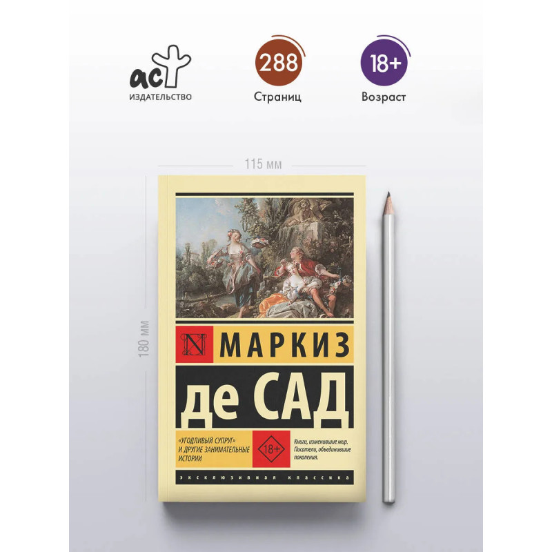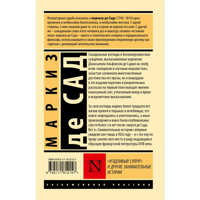 Скандальные взгляды и бескомпромиссные суждения, высказываемые маркизом Донасьеном Альфонсом де Садом на злобу всем "холодным и скучным моралистам", зачастую затмевали многочисленные достоинства его прозы, но в вошедших в это издание коротких и уморительных рассказах на первый план выходят именно изысканный слог, утонченный юмор и яркие и искрометные высказывания. За свои взгляды маркиз более тридцати лет жизни провел в тюрьмах и лечебницах, его книги запрещались и уничтожались, а иные произведения и вовсе были опубликованы спустя более ста лет после смерти де Сада. Вот и "Занимательные истории" впервые увидели свет лишь в 1926 году — и с тех пор по праву заняли свое место в ряду выдающихся образцов французской литературы XVIII века.