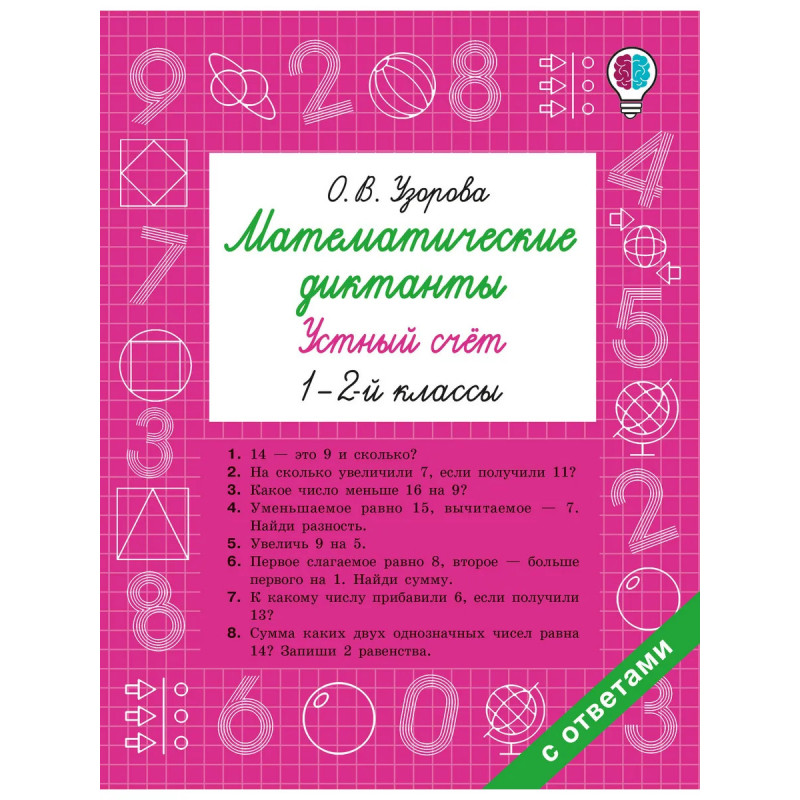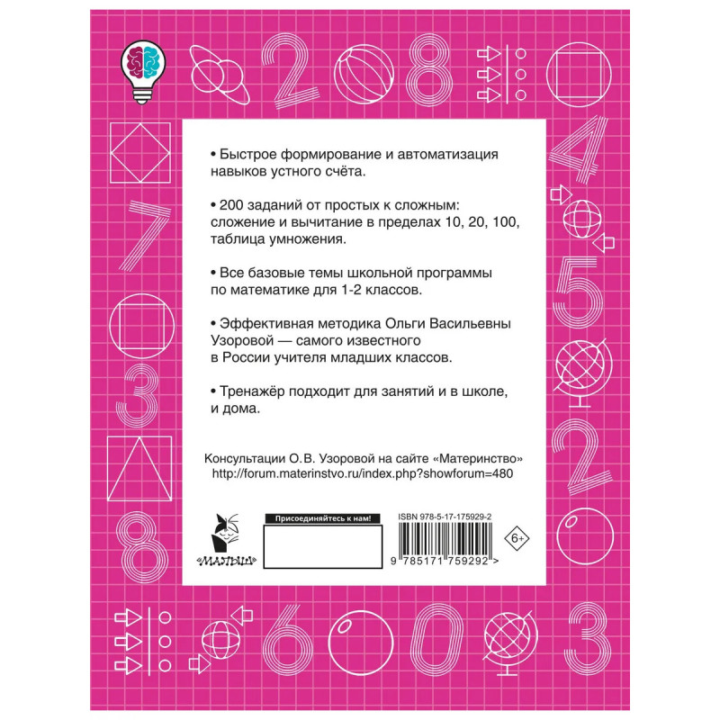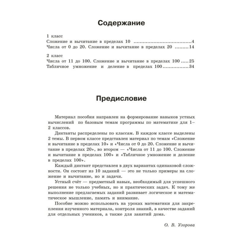Навыки устного счёта пригодятся не только на уроках математики, но и в повседневной жизни. Хотите, чтобы ребёнок автоматизировал устный счёт за короткое время? Поможет эффективная методика Ольги Узоровой — самого известного в России учителя младших классов. В основе методики на первом месте стоит осознанность тех или иных приёмов устных вычислений, а не механическое их применение. Задания расположены от простых к сложным: сложение и вычитание в пределах 10, 20, 100 и таблица умножения. Тренажёр имеет удобный практичный формат: размер школьной тетрадки, 48 страниц. Пособие можно использовать на уроках математики в 1-2 классах, а также для самостоятельной работы дома. Занятия устным счётом развивают у ребёнка сообразительность, быстроту реакций, внимание, память, формируют математическую интуицию и логику. Полезно, интересно, быстро, эффективно!