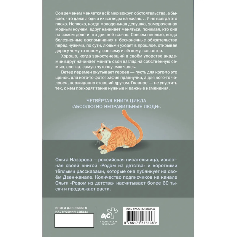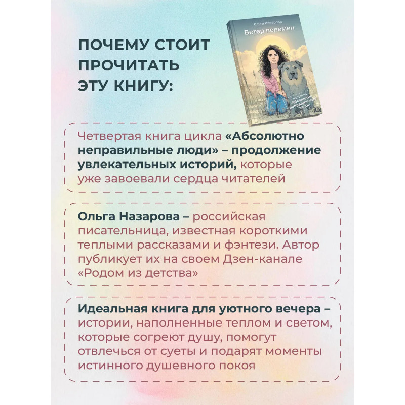 Как меняются люди под влиянием перемен и какой у этого исход? Ольга Назарова, российская писательница и автор популярного Дзен-канала «Родом из детства», делится секретами тонких душевных превращений между людьми в книге «Ветер перемен». Четвертый роман в цикле «Абсолютно неправильные люди» отличается практичностью обложки, покрытой лаком, и компактностью формата, что позволяет всегда носить его с собой в сумке. Любимая книга всегда под рукой! Изменения ведут к лучшему – люди сбрасывают груз прошлого, освобождая место чему-то новому и светлому. Главное – разглядеть тех, кто их приносит в нашу жизнь!