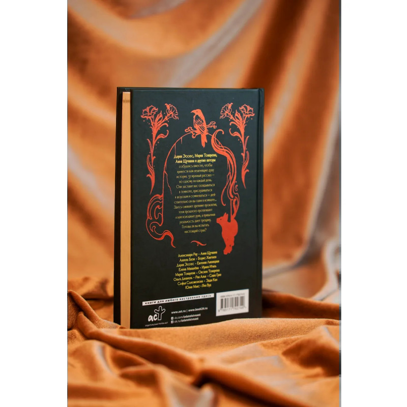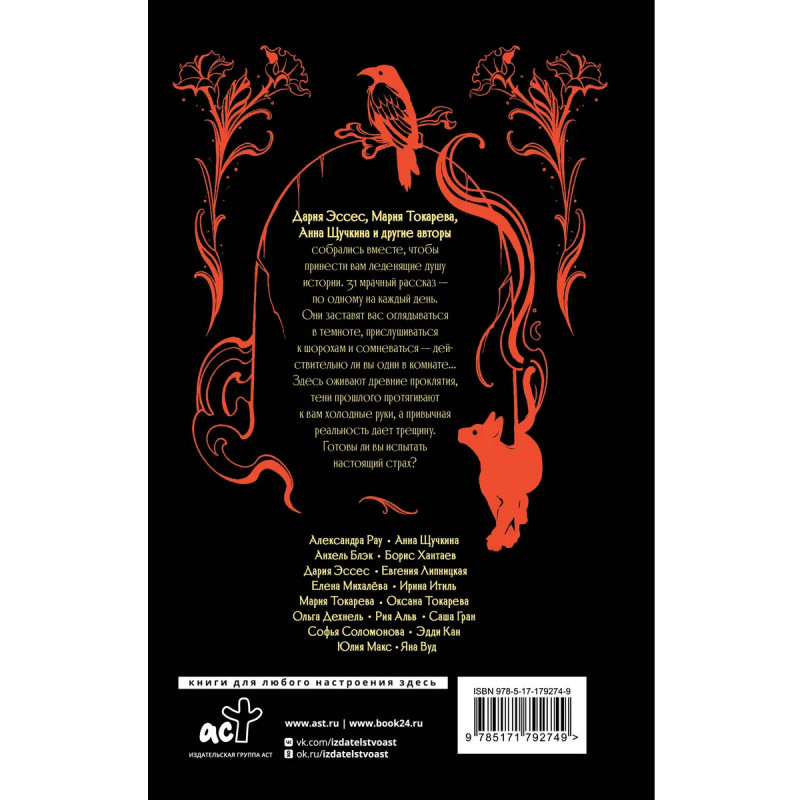 – Готовься к Хэллоуину заранее! Новинка — книга-адвент: 31 мрачный и захватывающий рассказ на каждый день октября. – Авторы: Дария Эссес, Анна Щучкина, Мария Токарева и др. – Яркая обложка от художницы Алены Борзениной (Tattoo Ramen). – Стильная верстка и удобный трекер чтения внутри. – Бонус — стикерпак с иллюстрациями Александры Еремеевой в каждом экземпляре! – Серия «Словотворцы магических миров»: лучшие истории для ценителей жанра фэнтези. Читайте также: « Живой ты не вернешься» Пальмиры Керлис, «За гранью разлома» Алисы Мак, «Последний Словотворец» Ольги Аст!