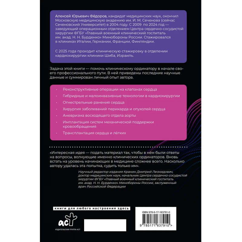 Задача этой книги — помочь сделать первые шаги в профессии молодому специалисту. В ней заложена попытка автора посмотреть на этап клинической ординатуры глазами хирурга, обладающего опытом и знаниями, правильно расставить акценты и предостеречь от возможных ошибок, цена которых в кардиохирургии традиционно высока. Материал будет полезен студентам, интересующимся кардиохирургией, участникам студенческих научных кружков, клиническим ординаторам, аспирантам и врачам — сердечно-сосудистым хирургам в первые годы самостоятельной работы.