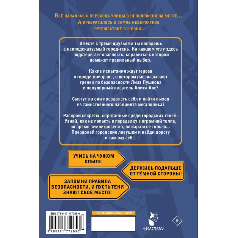Что скрывает теневая сторона города? В этой книге тренер по безопасности Лиза Пушкова и популярный писатель Алиса Аве поделятся секретами выживания в мегаполисе. Вас ждет увлекательное путешествие в непредсказуемый город-тень. На каждом шагу здесь подстерегает опасность, преодолеть которую помогает правильный личный выбор. Как вести себя в толпе, что делать при пожаре в торговом центре, чем опасны объявления о лёгком заработке и многие другие правила безопасности предстоит усвоить героям этой книги - трем подросткам, которые неправильно перешли дорогу и очутились в призрачном мире. Совершенно обычный день превратился для героев истории в невероятное приключение, после которого ни одно правило безопасности не будет забыто. На пути к спасению ребятам предстоит найти выход не только из теневого города, но и лучше понять себя. Книга способствует личностному росту, развитию эмоционального и социального интеллекта, эмпатии. Каждая глава сопровождается иллюстрациями в стили комиксов. Учитесь на чужом опыте!